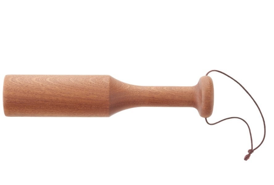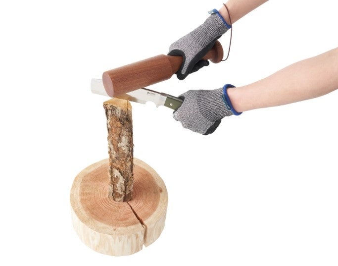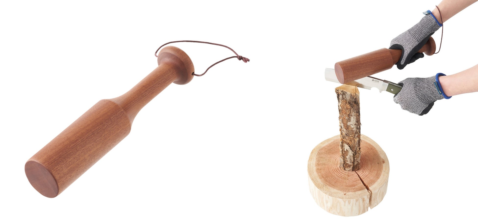 薪にナタやナイフを乗せ、ブレード(刃体)の背中を叩くことで、小割りの薪を作る「バトニング」用のこん棒。斧のように刃を振り下ろすことがないため、だれでも安全に割りたいサイズに割ることができる。