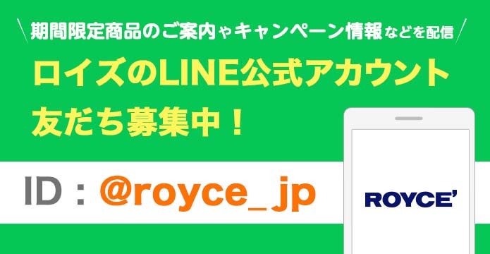 ロイズのLINE公式アカウントでは、期間限定商品のご案内やキャンペーン情報などをお知らせしています。ぜひ友だち追加をお願いいたします。