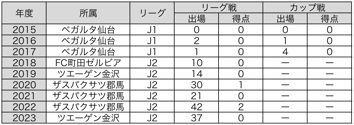 行田ペガサスサッカースポーツ少年団-クマガヤサッカースポーツクラブ-ベガルタ仙台ユース-ベガルタ仙台-FC町田ゼルビア(期限付き移籍) - ベガルタ仙台 - ツエーゲン金沢(期限付き移籍) - ベガルタ仙台 - ザスパクサツ群馬