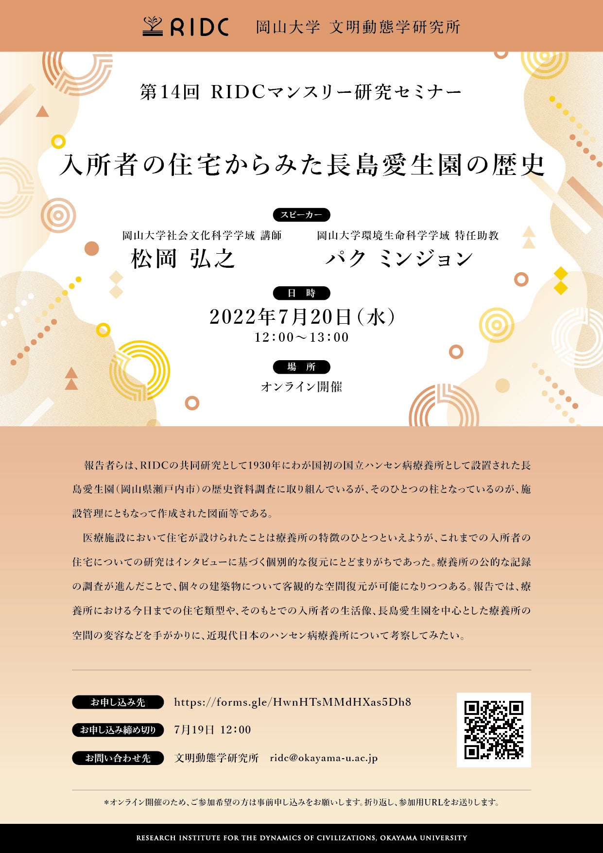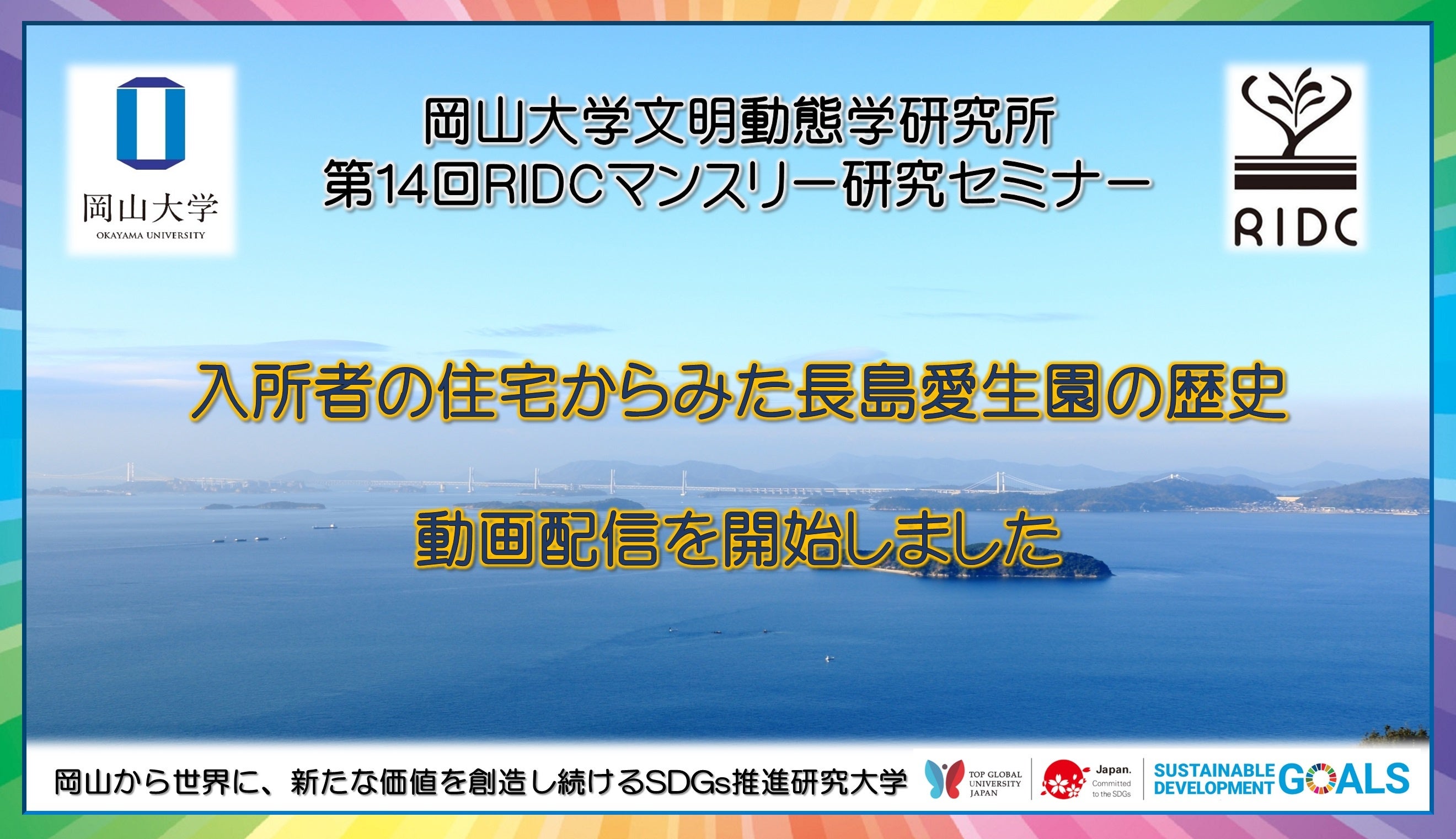 今回、 2022年7月20日(水)にオンライン開催した第14回RIDCマンスリー研究セミナー「入所者の住宅からみた長島愛生園の歴史」(スピーカー:松岡 弘之 岡山大学 学術研究院 社会文化科学学域 講師、パク ミンジョン 岡山大学 学術研究院 環境生命科学学域 特任助教)の録画配信を開始しました。ぜひ皆様にご視聴頂けますと幸いです。