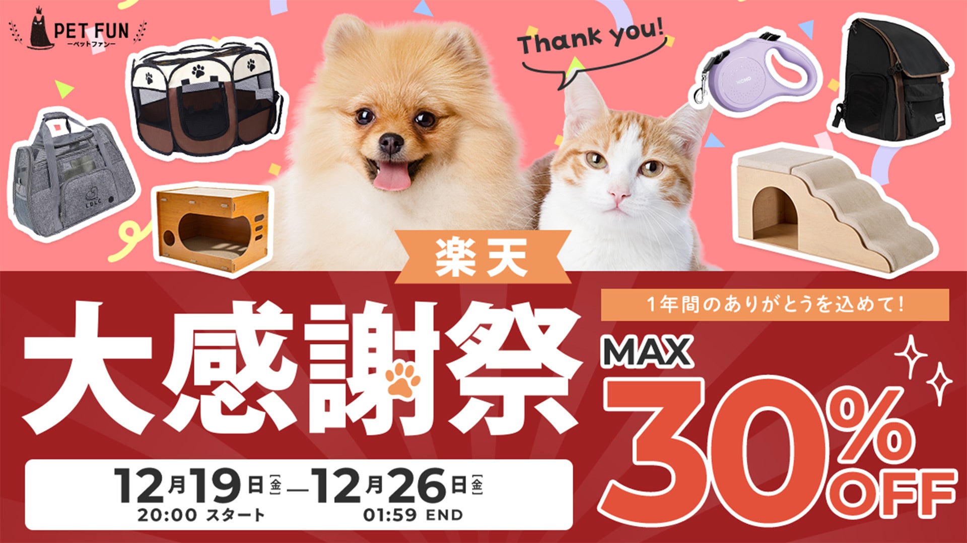 現在PetFun(ペットファン)楽天市場店では、12月26日(金)まで大感謝祭セールを開催中。