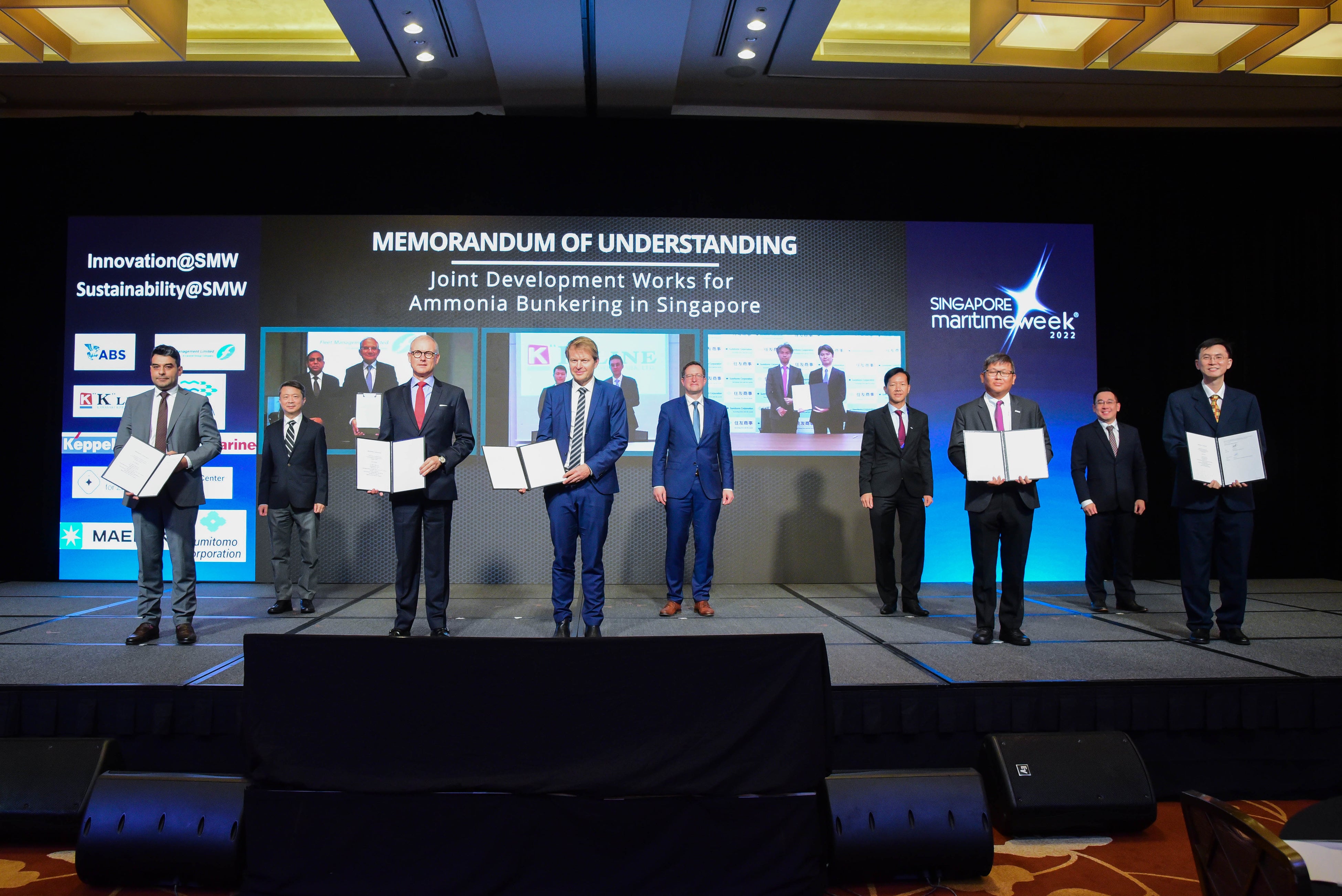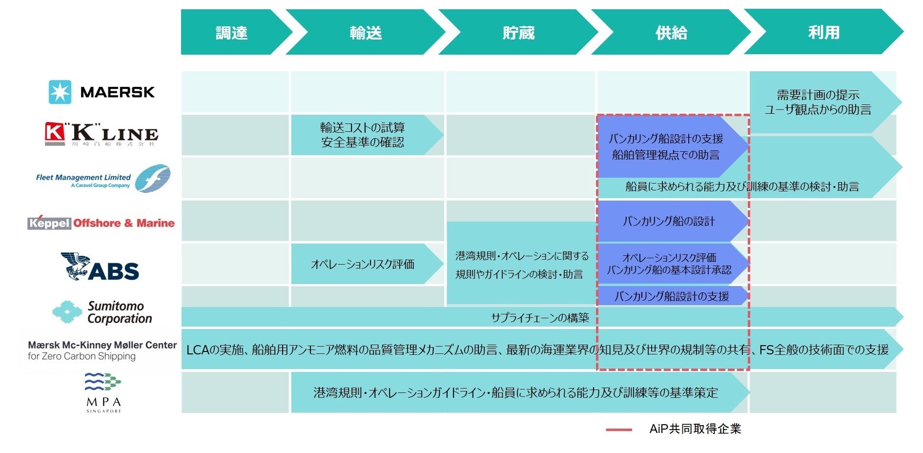 A.P. Moller - Maersk A/S、Fleet Management Limited、Keppel Offshore & Marine、Maersk Mc-Kinney Moller Center for Zero Carbon Shipping、住友商事株式会社、American Bureau of Shipping(以下「ABS」)によるシンガポールにおける船舶向けアンモニア燃料供給の実現に向けたコンソーシアム(以下「本コンソーシアム」)に、新たなメンバーとして川崎汽船株式会社(以下「川崎汽船」)、シンガポール海事港湾庁(以下「MPA」)が2022年4月に加入し、共同検討の加速に向けた覚書を締結しました。今後、本コンソーシアムのメンバーを中心に、2020年代後半からの船舶向けアンモニア燃料供給の実現を目標として、より具体的な検討・準備を進めていきます。また、本コンソーシアムは、2022年5月6日に事業開発の一環として、ABSよりアンモニア燃料供給船の設計基本承認(Approval in Principle、以下「AiP」)を取得しました。