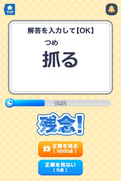 広告を視聴することで正解の最初の1文字を見ることができます。不正解でも広告を視聴することで正解を確認でき、さらに参加得点が加算されます。