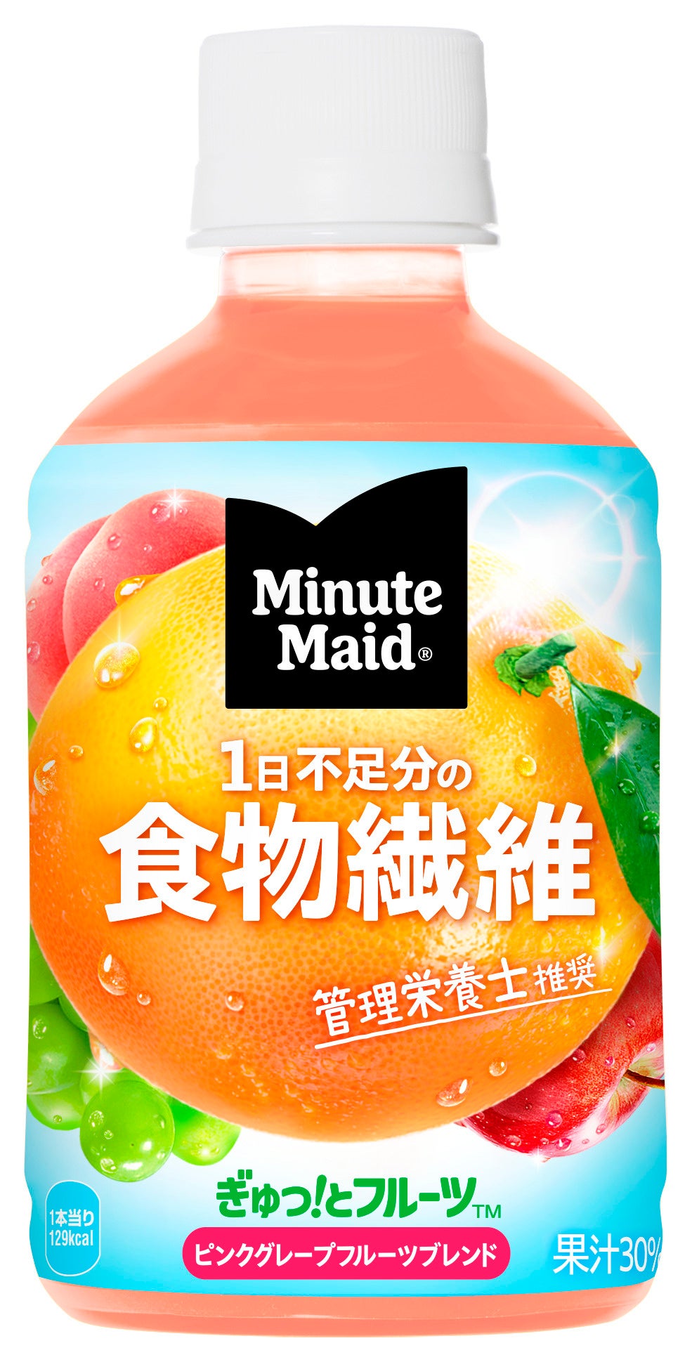 「ミニッツメイド ぎゅっ!とフルーツ ピンクグレープフルーツブレンド 食物繊維」は、グレープフルーツに、ももとりんご、ぶどうをブレンドした飲料で、男性、女性ともに不足(*1)しがちな食物繊維を100ml当たり1.9g摂取することができます。