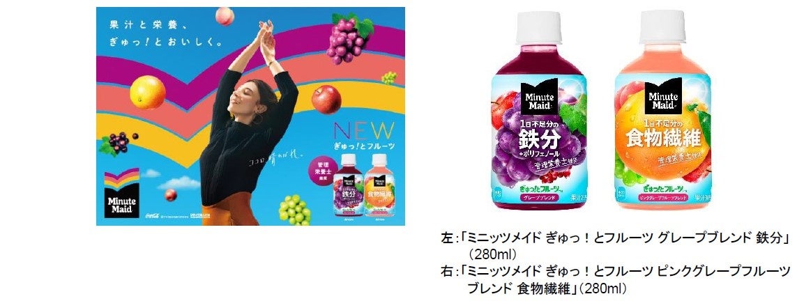 新シリーズ「ミニッツメイド ぎゅっ!とフルーツ」が登場「グレープブレンド 鉄分」「ピンクグレープフルーツブレンド 食物繊維」4月3日(月)より全国発売