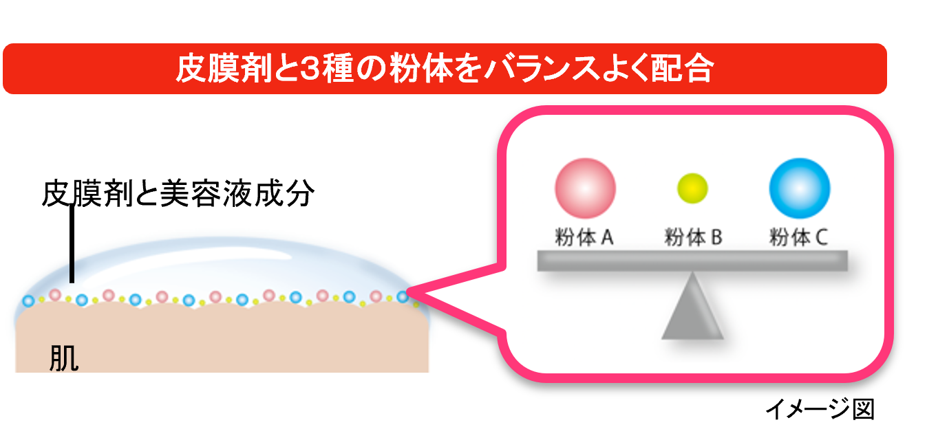 肌の隙間に入りこむように、皮膜剤と3種の粉体をバランスよく配合したプレミアムフィット処方を採用。