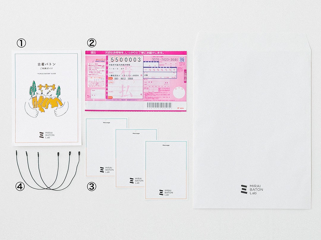 「古着バトン」では、家庭で不要になった衣類を、指定の「回収キット」を購入し郵送すると、古着として販売され、収益化されます。