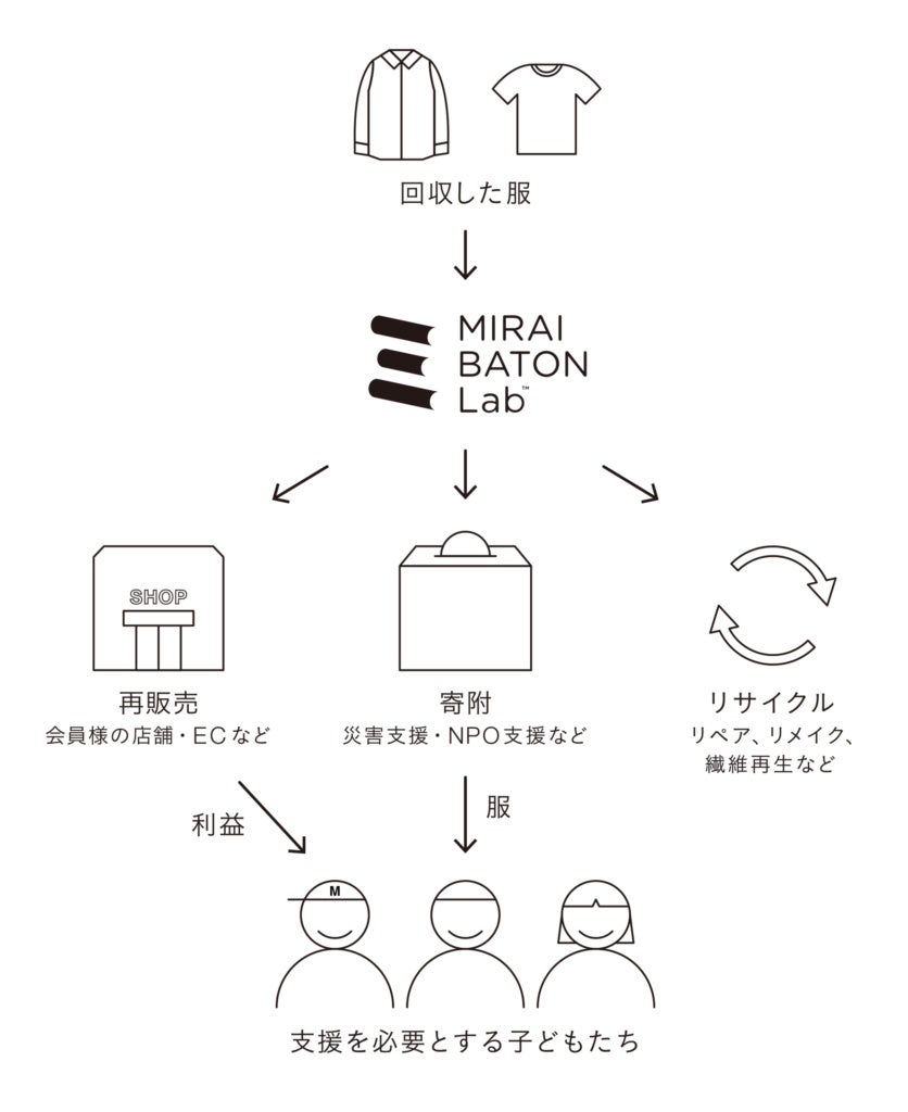 また、この活動から得られる一般社団法人 ミライバトン研究所の利益は全て全国の児童養護施設で暮らす子どもたちの心のケア、教育・就業支援、居場所作りなどを行う「一般財団法人 みらいこども財団 *²」へ寄附され、販売が難しい衣類については、リメイク・リサイクルといった資源再生に活用されます。