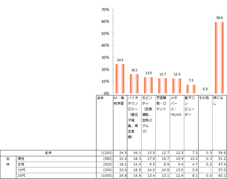 また、興味がある最先端技術の分野を伺ったところ、「特になし」が全体の約6割を占めた。「AI・機械学習」が全体で24.5%、性別では男性が31.4%となり、女性(18.1%)よりも13.3ポイント高い。