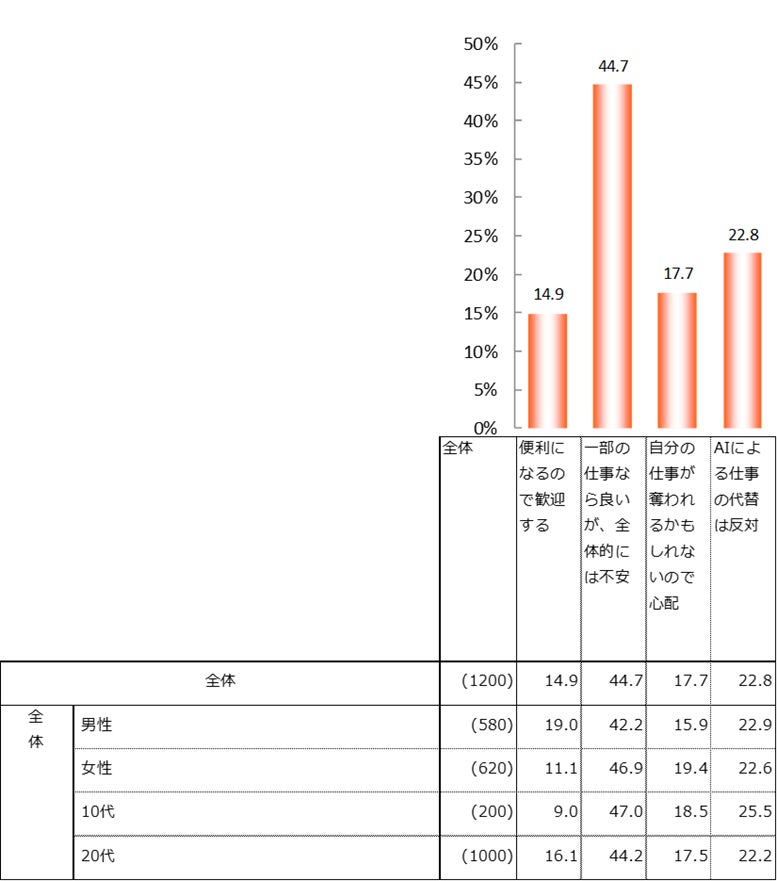AI(人工知能)が人間の仕事を代替することについて、「一部の仕事なら良いが、全体的には不安」が全体の44.7%でトップ、次いで「AIによる仕事の代替は反対」が22.8%、「自分の仕事が奪われるかもしれないので心配」が17.7%だった。合わせると、不安視する人が8割超となった。一方、「便利になるので歓迎する」は14.9%と最も低かった。