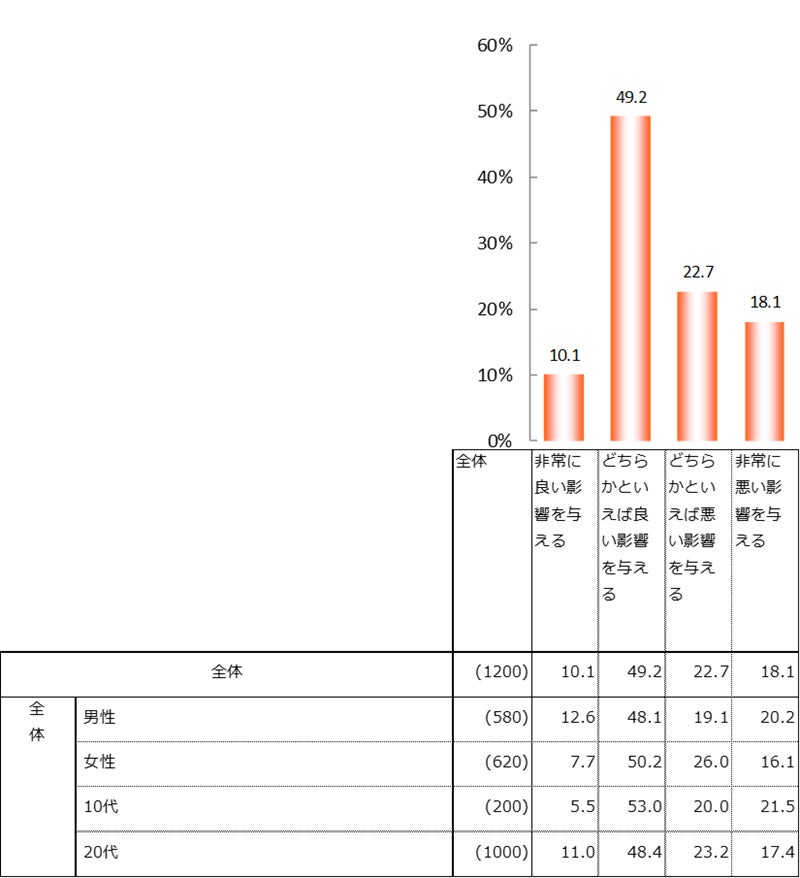 また、AIが今後の社会に与える影響について、「どちらかといえば良い影響を与える」が全体の49.2%で約半数を占めた。「非常に良い影響を与える」(10.1%)と合わせると59.3%となり、肯定的に捉える人の方が多かった。