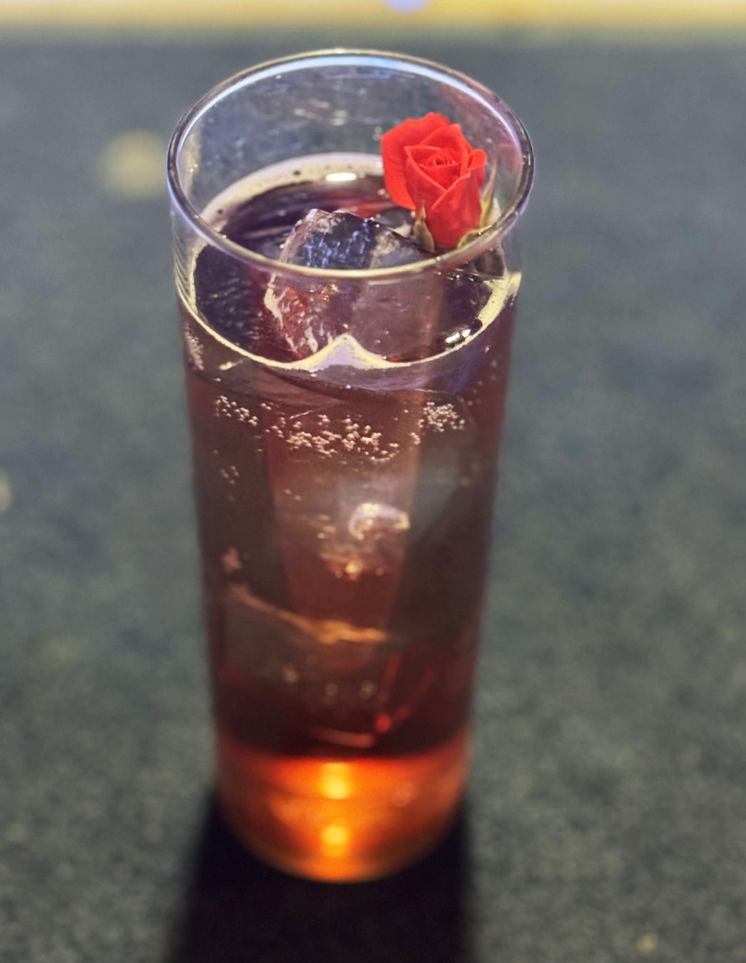 フルーツやスパイスをブレンドしたリキュール「ドラキュラズブラッド」とジンジャーエール。刺激的な味わいのカクテル。