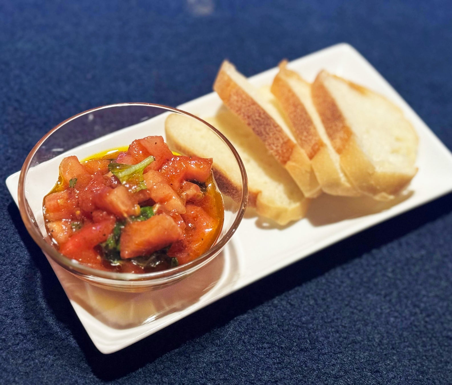 トマト、バジル、オリーブオイル。食材3つの三つ巴 赤いブルスケッタ。