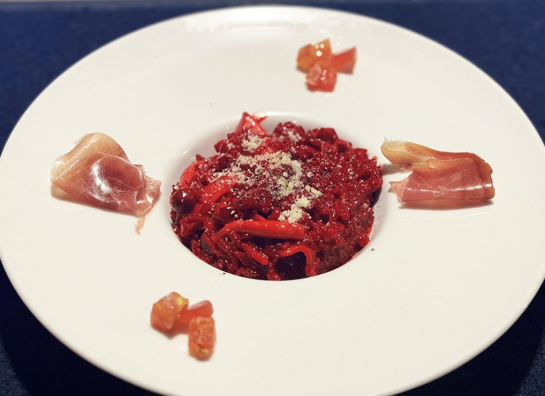 鮮やかな赤にチーズのまろやかなコク。黒胡椒がアクセント。