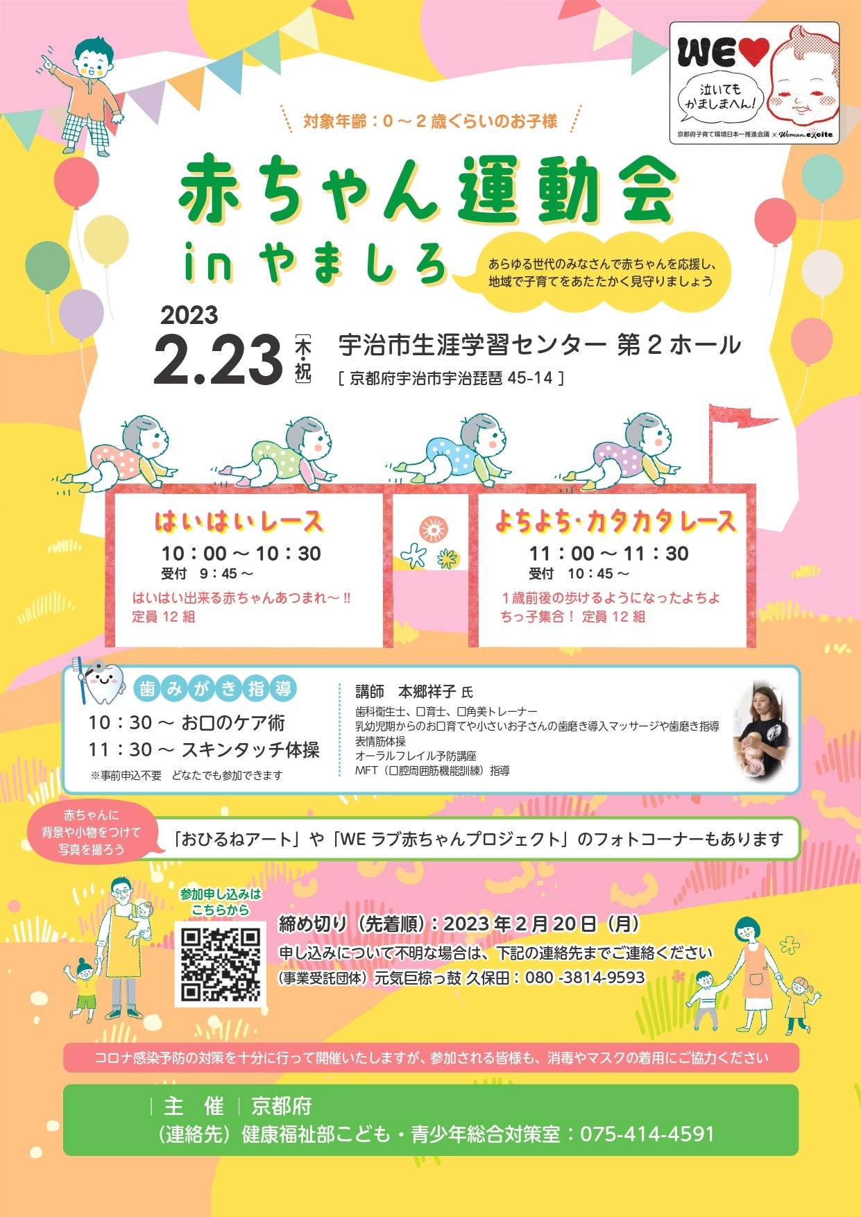 京都府では、2月23日(木・祝)に、宇治市生涯学習センターで「赤ちゃん運動会 in やましろ」を開催します。はいはいができるお子さん、1歳前後の歩けるようになったお子さん、是非ご参加ください!※赤ちゃん運動会への参加は事前申込が必要です。(参加無料)