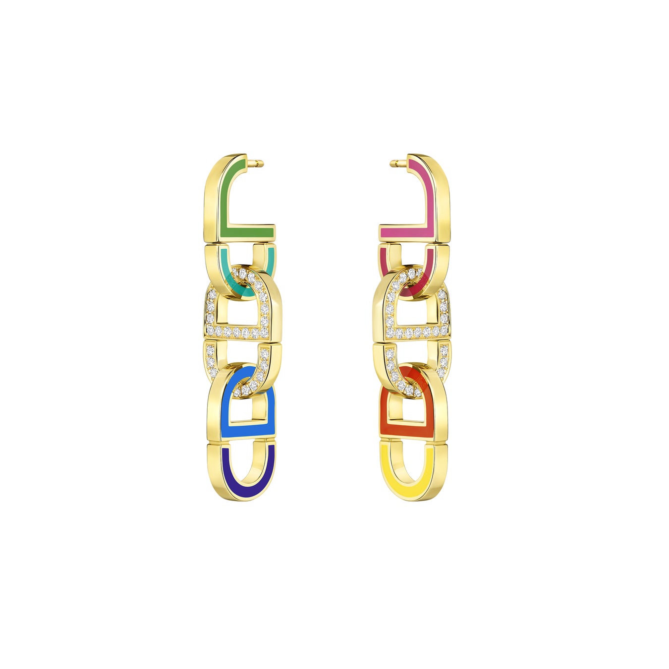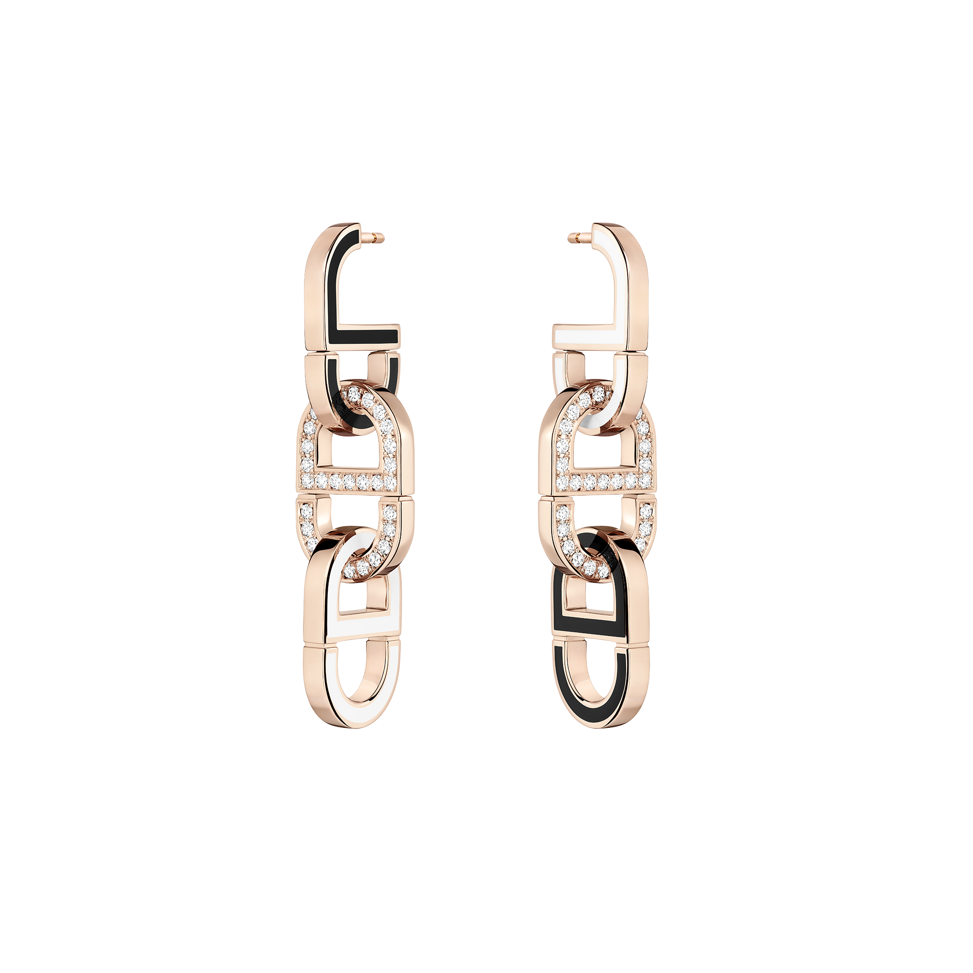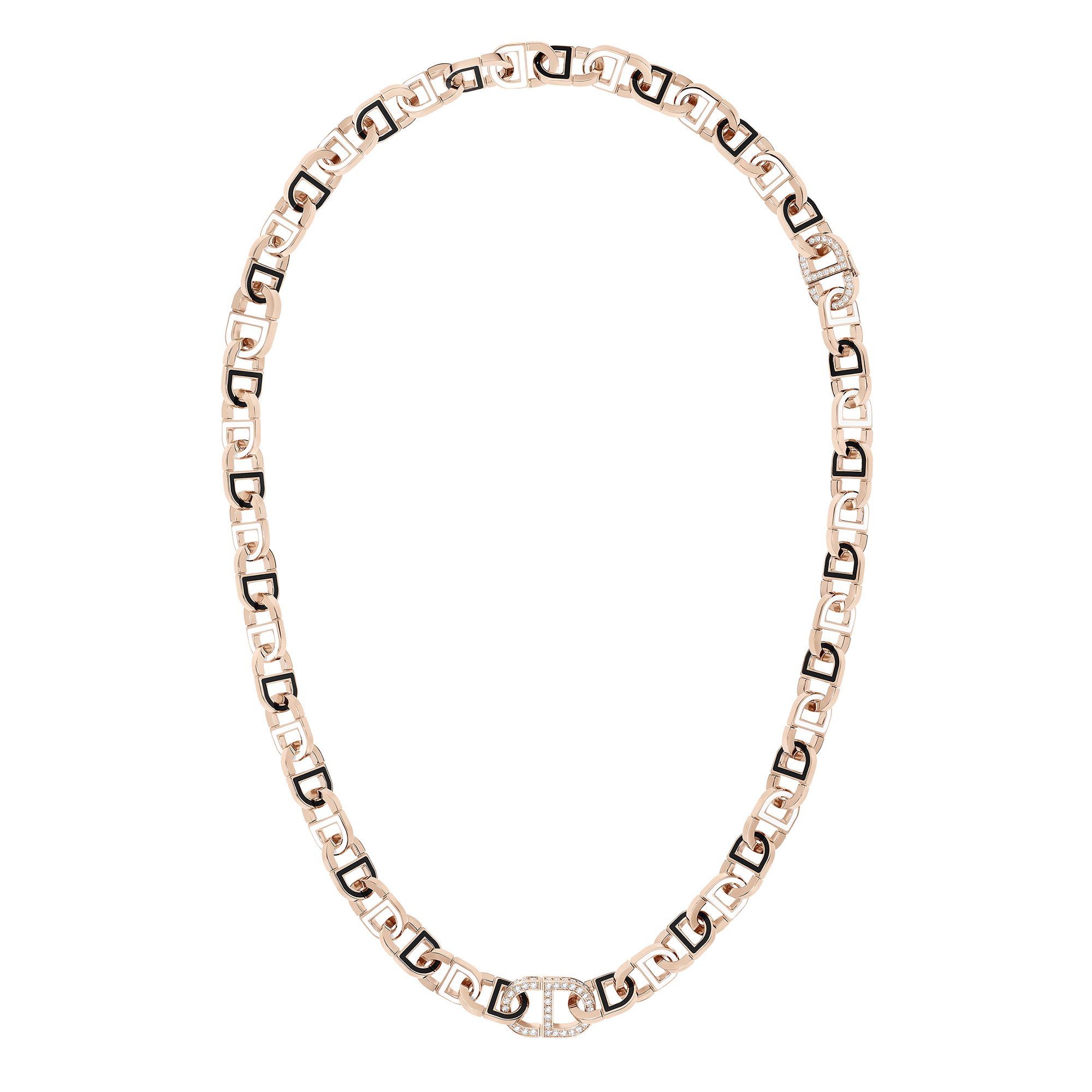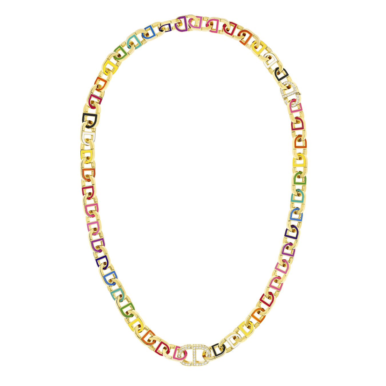 ヴィクトワール・ドゥ・カステラ―ヌによる「カラー ディオール(Color Dior)」のクリエイションによって、大胆さと繊細さのバランスが織りなすチェーンは生まれ変わったのです。2つのパリュールを取りそろえる同コレクションは、グラマラスさと遊び心が見事に融合した、コンバーチブルなデザインが特徴で、さまざまなスタイルを楽しむことができます。クリスチャン・ディオールのイニシャルは、イエローゴールドやピンクゴールド、ダイヤモンドとラッカーといった色彩の組み合わせによって、繊細なオブジェへと昇華されました。メゾンのシグネチャーであるグラフィックモチーフは、ロングネックレスからチョーカーとブレスレットへと変わります。10色のカラーラッカーをあしらったネックレス、8色にダイヤモンドを組み合わせたイヤリング。つづくブラック&ホワイトからなるネックレスは、センターリンクにダイヤモンドがパヴェセッティングされています。イヤリングは、これまでにないほどに自由で洗練されたスタイルに、調和と現代的なシンメトリーをもたらします。