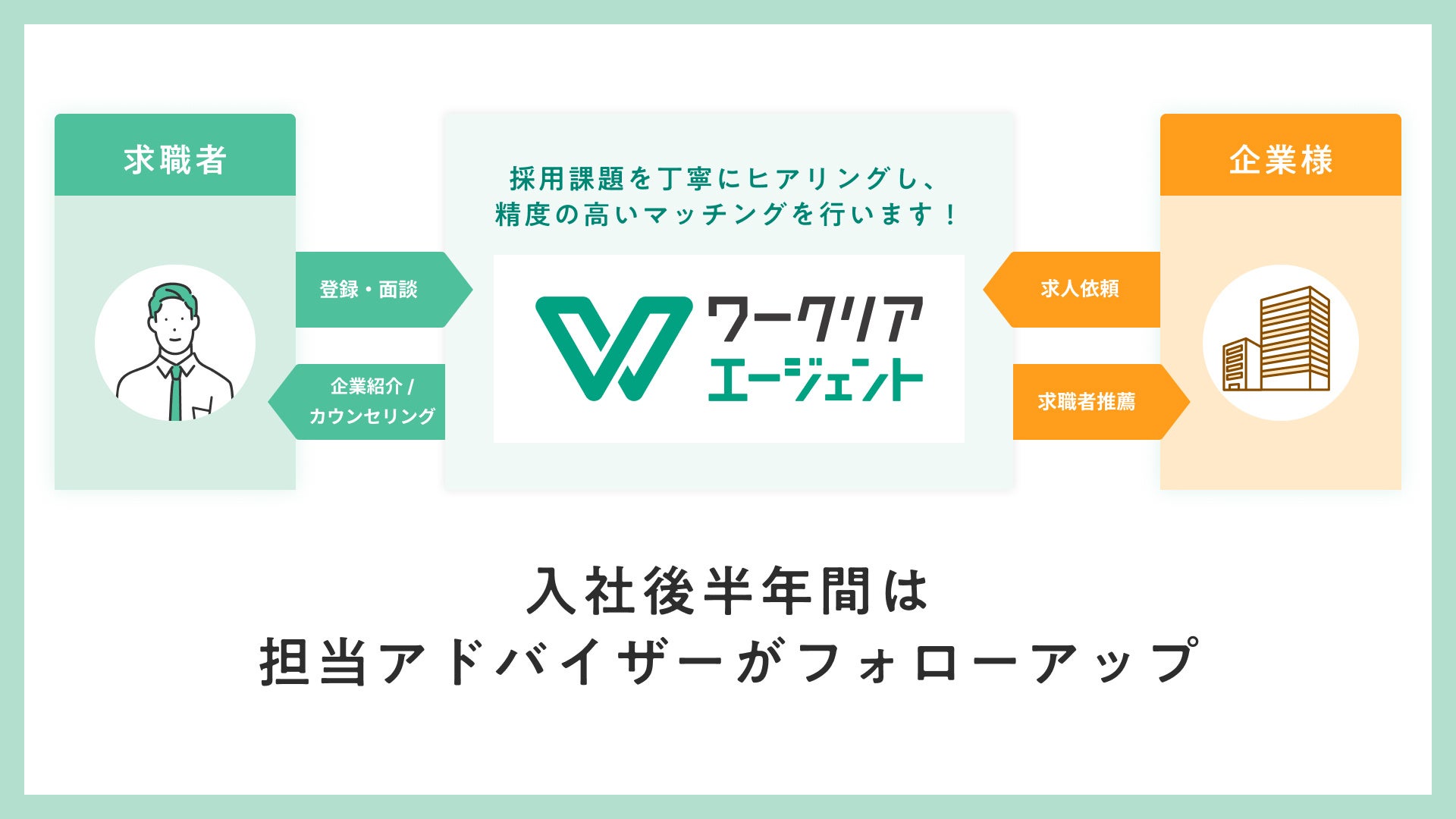 その可能性を最大限に引き出すのが、私たち「ワークリアエージェント」です。私たちの支援は、最適なマッチングで終わりません。自社で定着率90%超を達成した独自のノウハウを基に、入社後半年間のフォローアップまで徹底的に伴走します。