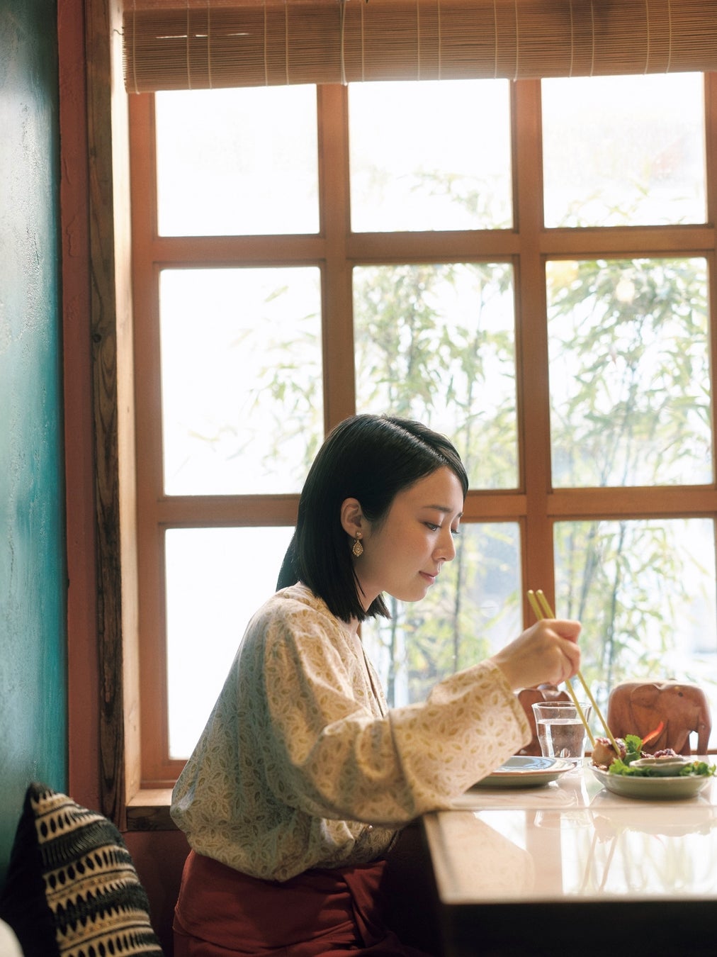 「メンズノンノで、しかも世界の料理を食べる連載が始まると聞いたとき、思わず『よっしゃ!』って言っちゃいました! どうやら私がごはん好きということを見抜いて、日本のレストランを巡りながら食を通して世界旅行をするというすてきな企画をくださったみたいで。私は、食べることが好きで、『今日は何食べようかな』って思いながら日々過ごしていて。おいしいごはんって、どんなに悲しいときもつらいときも、幸せな気持ちにしてくれるんです。敬愛する脚本家の坂元裕二さんがドラマ『カルテット』の中で書いた『泣きながらごはん食べたことある人は、生きていけます』という大好きなセリフのとおり、心とごはんと人生は切り離せないもの。ちなみに私は、仕事でうまくいかなくて、悔しさのあまり泣きながらカツ丼を食べたことがあります(笑)。それに、ごはんって気持ちと強く結びつくから、記憶ともリンクしますよね。思い出の味を食べたとたん、一瞬でそのときに戻れちゃう。そして、この連載では、その国を連想させるような服を着たいと思っているんです。ファッションも含めて全身でその国を楽しみたいという気持ちでいます。この料理じゃないとこの食材と味は巡り合わないとか、同じ食材でもこんな使い方があるとか、“国ごとに違うこと”と“国が違っても同じこと”を発見していけたら楽しいなって。あと、その国の『おいしい』という言葉をどんどん学んでいきたいです!」