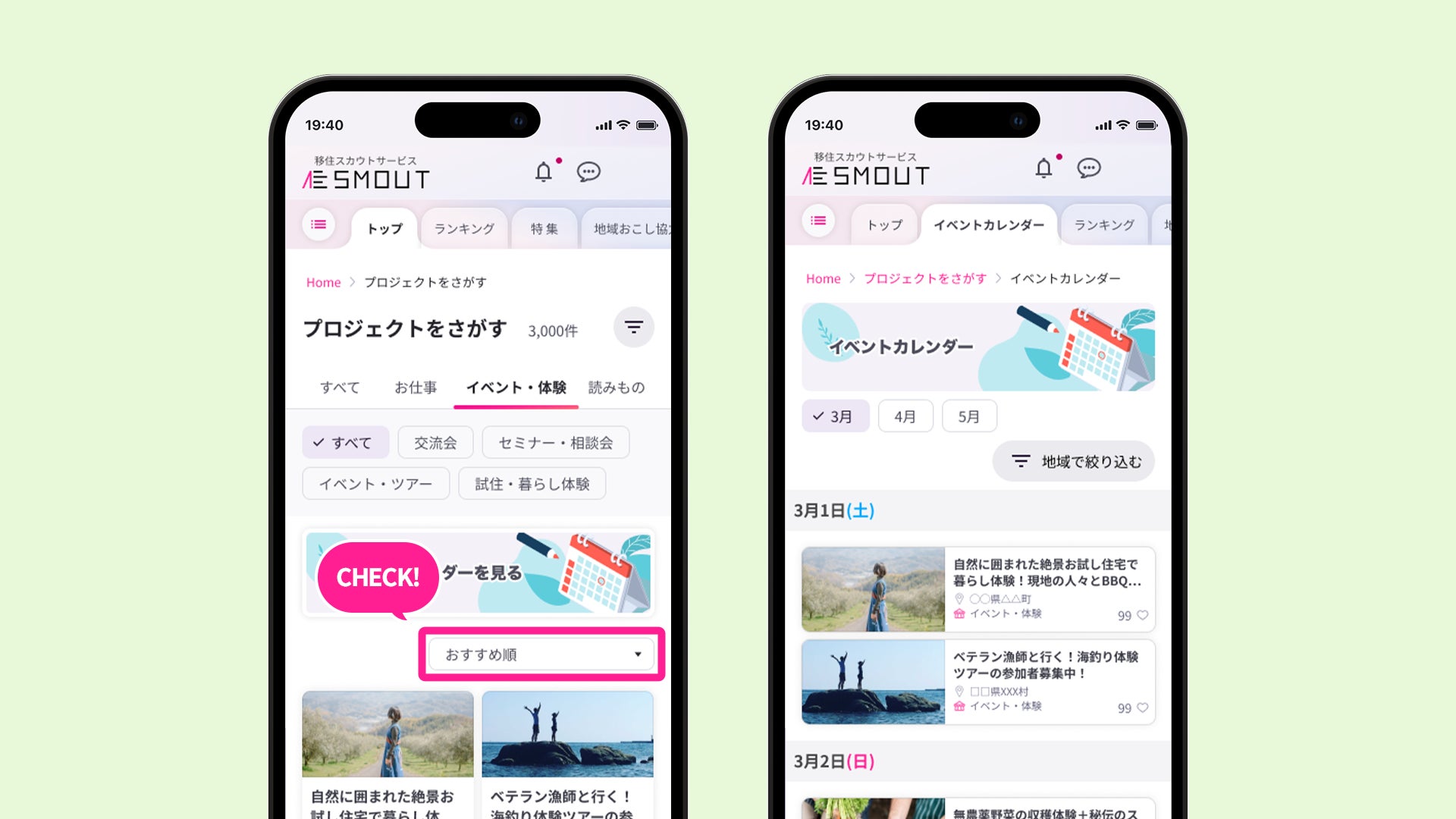 また、今回のLINE連携に加え、「SMOUT」サイト上でも新たな機能を追加しました。2024年末に行った大幅リニューアルに続き、ユーザーから要望が多かった「イベントカレンダー」とプロジェクト検索の「おすすめ順」表示の2つの機能を導入。これにより、地域の体験行事やツアーを簡単に探せるほか、ユーザーの興味や価値観に合ったプロジェクト情報を効率的に見つけられるようになりました。「SMOUT」を通じた地域との出会いが、より便利に、より楽しく進化します。