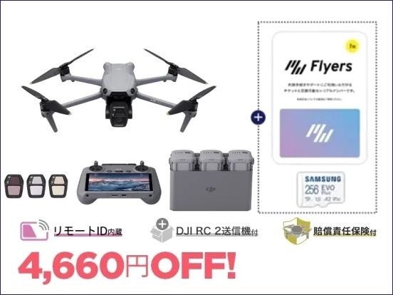 DJI Air 3S 、DJI RC 2送信機、バッテリー✕3、 NDフィルターセットなどを含んだ包括的なセットです。全国のフライトエリアでの飛行手続きが依頼できる「Flyers」フライトチケット1枚と256GBのmicroSDカード も付いたセキド限定のお得な組み合わせです。
