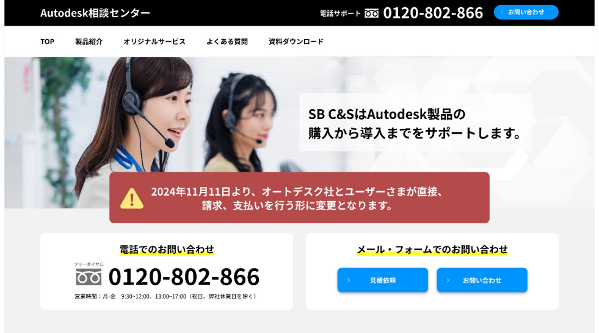 SB C&Sは、これまで2D/3D CAD製品の専任チームによるオートデスク製品の販売を販売パートナーとともに推進してきましたが、2024年11月からユーザーが直接オートデスクに支払いをする販売形態になります。オートデスク認定パートナーであるSB C&Sは、ユーザーおよび販売パートナーの相談窓口となる「Autodesk相談センター」を開設し、フリーダイヤルの電話サポートとお問い合わせフォームでご相談に対応します。