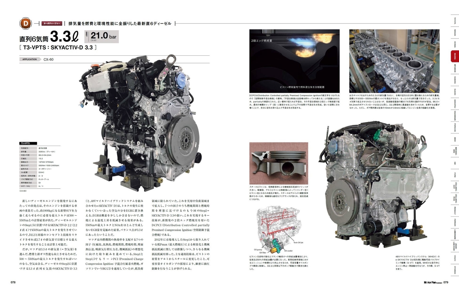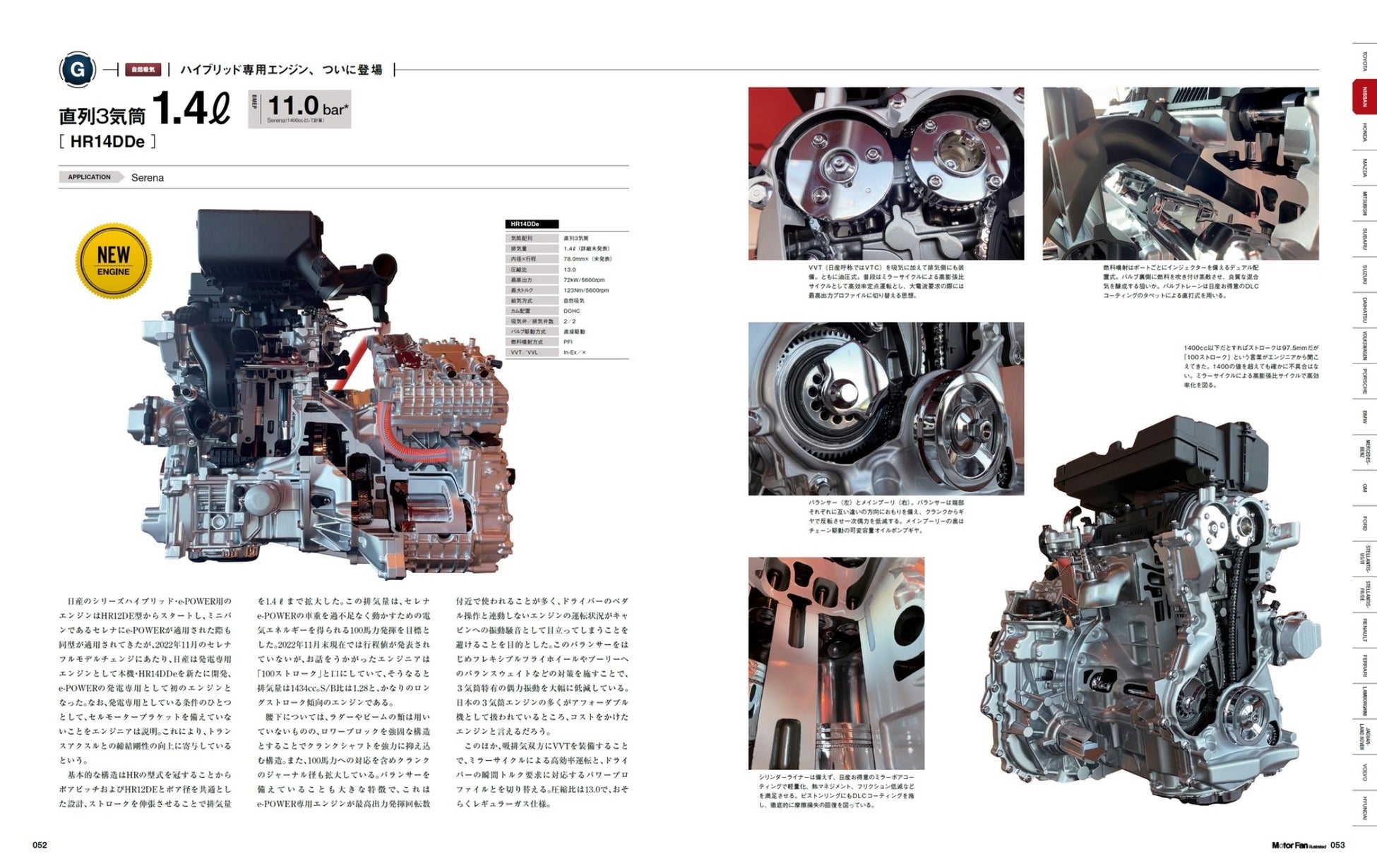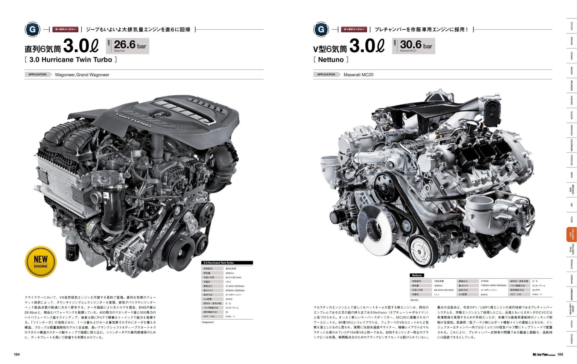 メインコンテンツのエンジンカタログについては、とくに国産エンジンの注目機を大きく取り上げました。新型プリウス用M20A型、新型セレナ用HR14DDe型、CX-60搭載のSKYACTIV-D 3.3、新型クロストレックが積むFB型などは解説本文を加えたスペシャル扱いのページ構成としています。そして各項においてはブランドが複雑に入り組む昨今の情勢を整理、たとえばステランティスにおいてはアメリカ/イタリア/フランスに大きく分けて紹介しています。