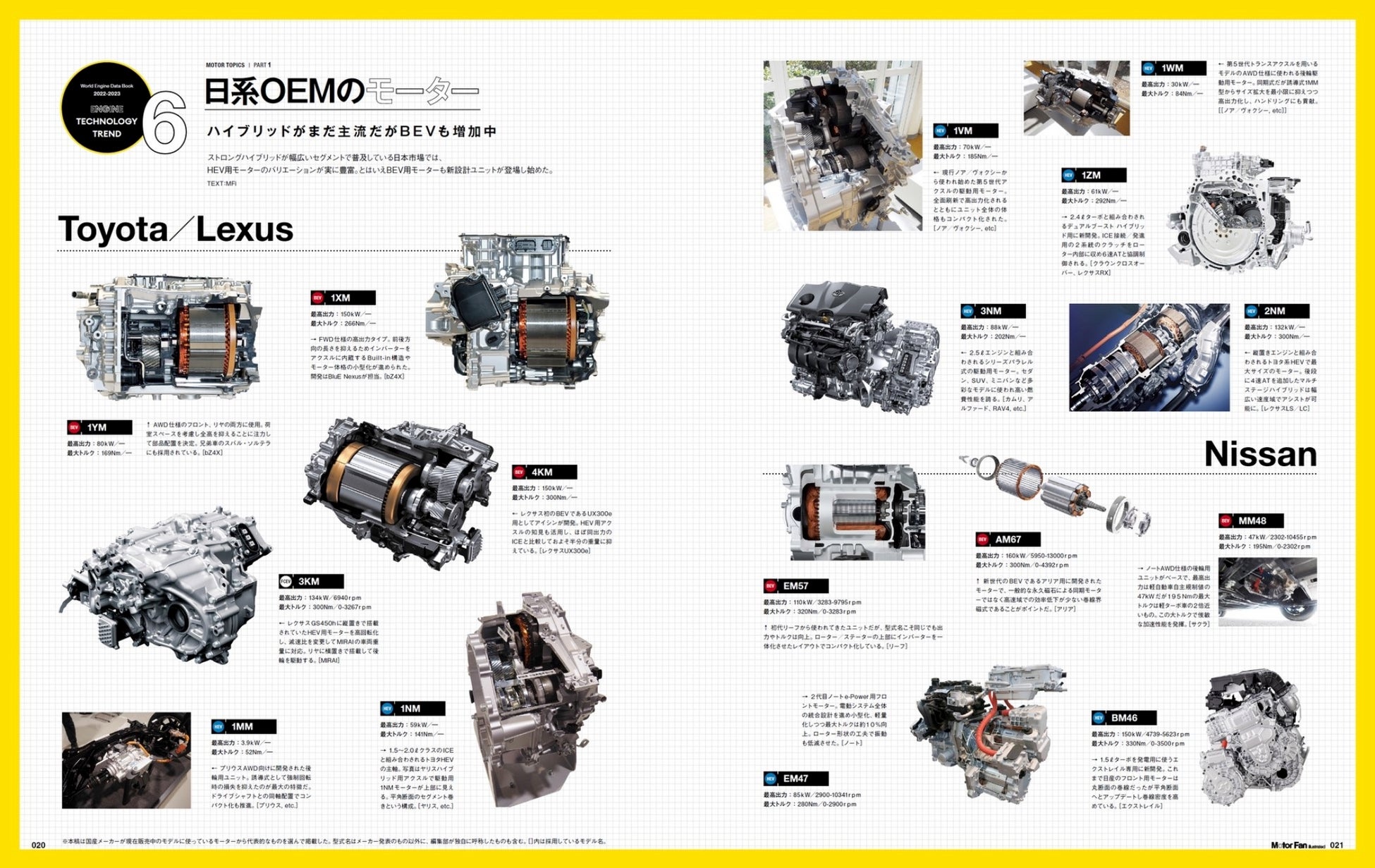 ご存じ電動化が急速に進む昨今、好むとこの混ざるとにかかわらず自動車のパワートレーンとしてモーターの存在は欠かせません。『WEDB2023年版』の巻頭コラムではハイブリッド用/電気自動車用のモーターについて、型式と出力/トルク、搭載車種例などを一覧にしました(Trend 6)。さらにはモーターという製品がどのように開発されているのか(Trend 7)、エンジンとモーターを組み合わせる各種の解説(Trend 8)など、多くの紙面を割いています。