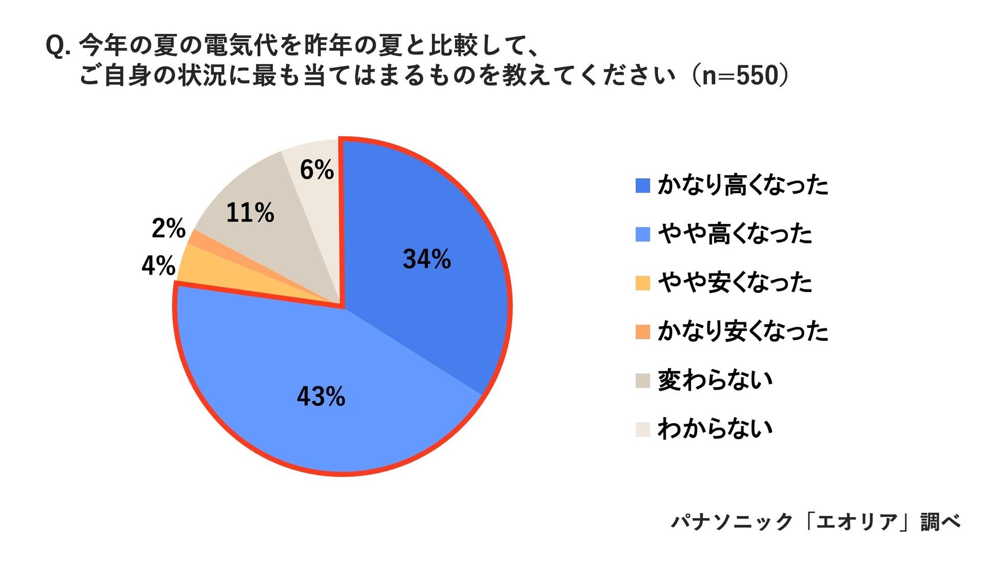 さらに、今年の夏の電気代を昨年の夏と比較したところ、34%が「かなり高くなった」、43%が「やや高くなった」と、77%が今夏の電気代が高くなっていることが判明しました。