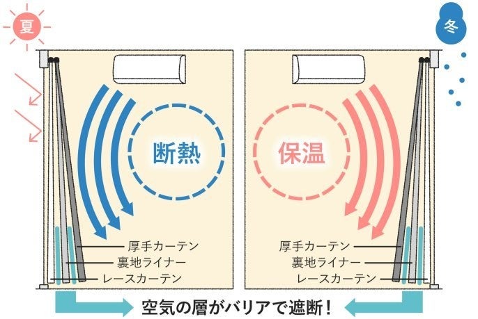 窓から入ってくる日光は意外にあなどれません。カーテンは日射を抑えて、窓との間に空気の層ができるので、断熱効果もあります。ただし、室内にあるカーテン自体も熱を持つため、窓に日よけをつける際には外側がおすすめ。窓の外にすだれやシェード、グリーンカーテンなどを設置するのが有効です。
