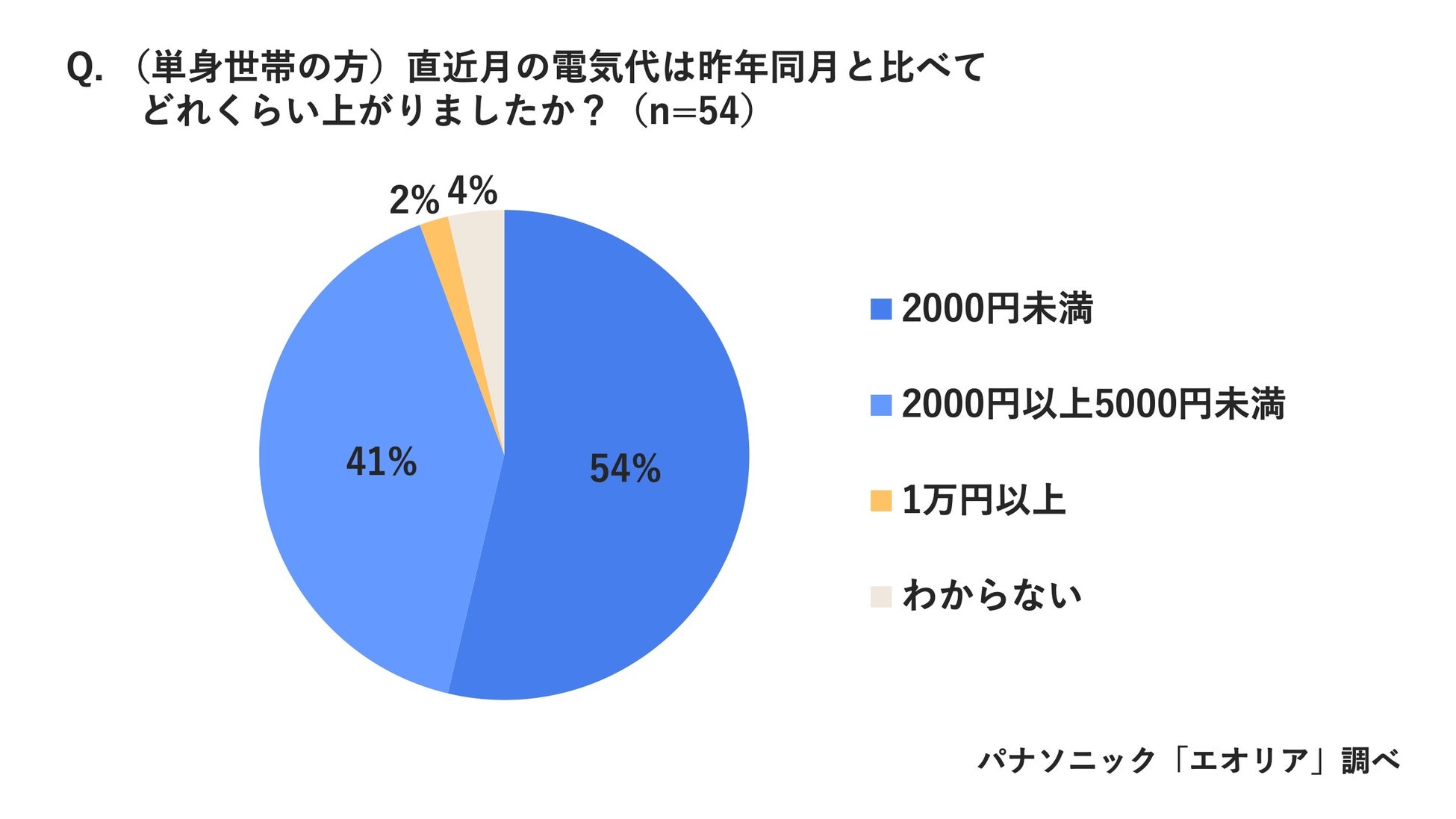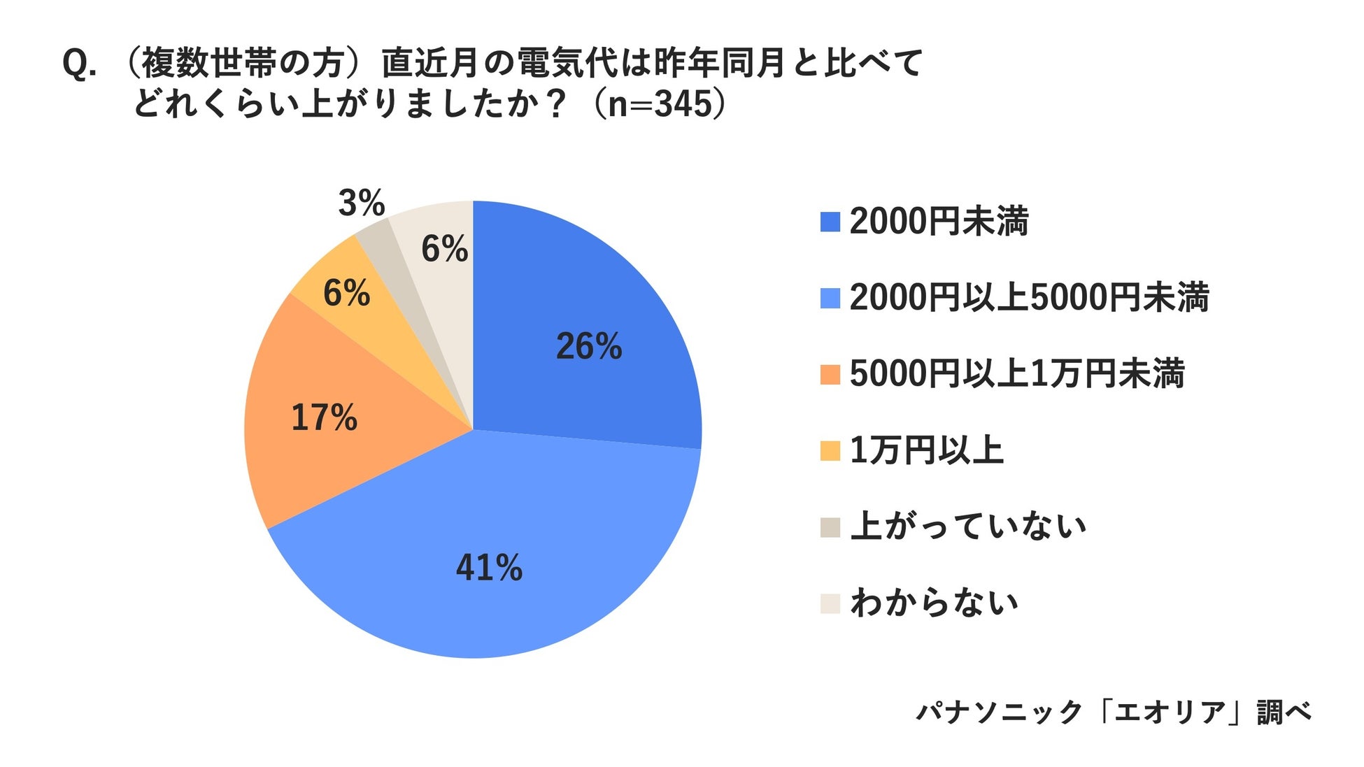 続いて、電気代の増加額を具体的に調査しました。単身世帯では「2000円未満」が最も多いものの、「2000円〜5000円未満」の回答が41%という結果に。複数世帯では、「2000円以上5000円未満」が41%で最多となりましたが、「5000円以上1万円未満」が17%、「1万円以上」上がったという世帯も6%いるようです。