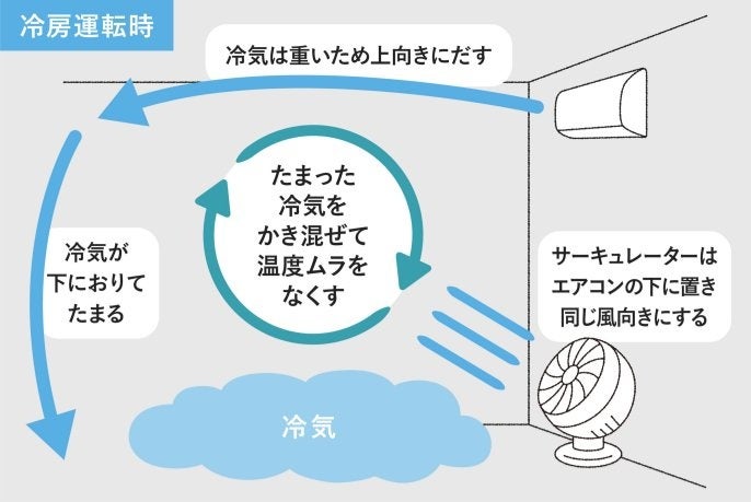 エアコンの風も上手に利用し、冷房効率を上げて節電に繋げましょう。まずは風向き。冷たい空気は低い場所にたまるため、一般的に冷房時は上向きで風を送ると広範囲を冷やせると言われています。扇風機やサーキュレーターを併用し、冷気のムラをなくすのもオススメです。