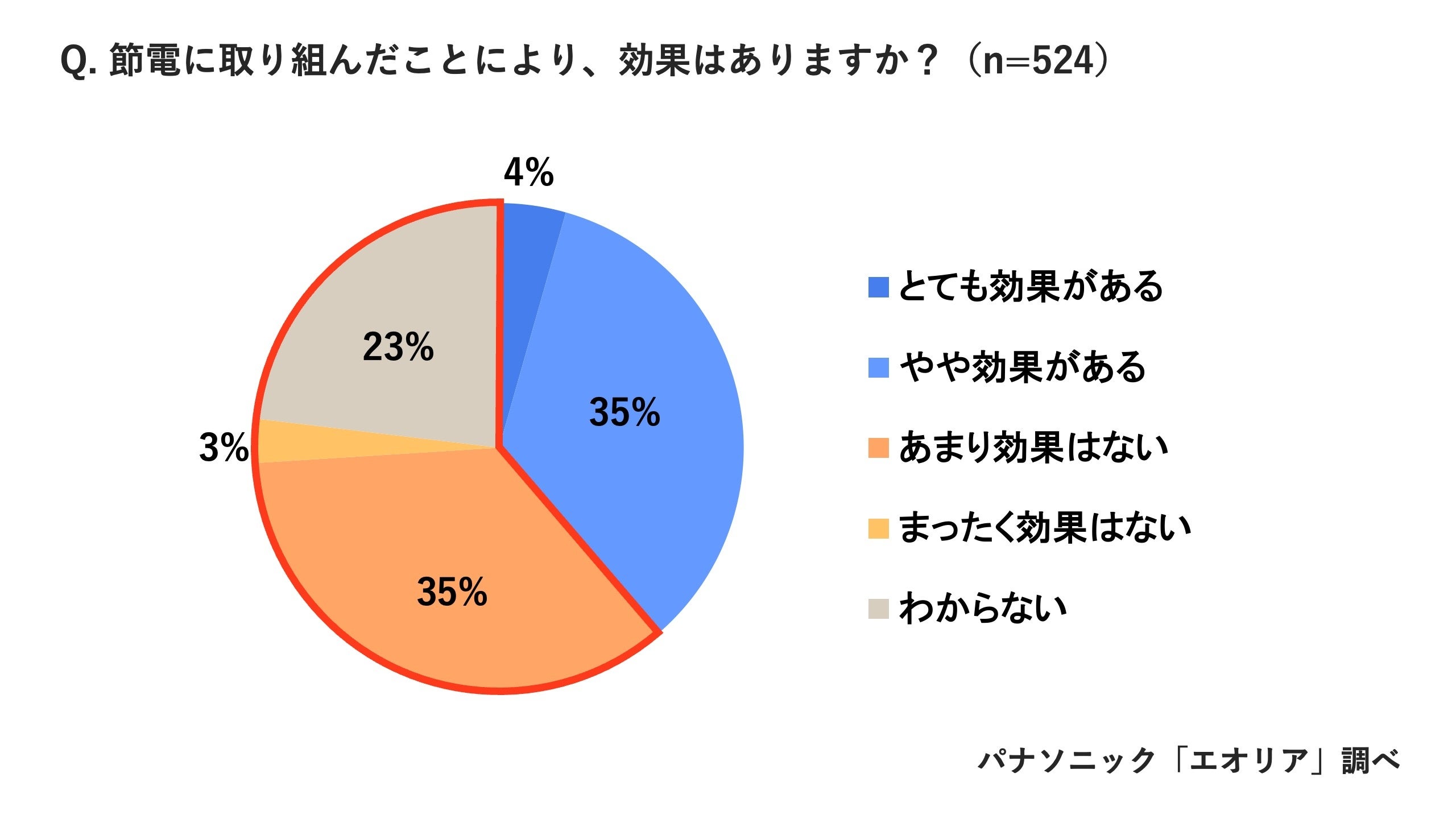 「今年の夏、節電に取り組んでいますか?」という質問では、「積極的に取り組んでいる」22%、「やや取り組んでいる」51%と、7割以上が今夏、節電に取り組んでいることがわかりました。一方、その効果については、39%が「効果がある」と回答する一方、61%が「効果がない」・「わからない」と回答しており、多くの方が節電に取り組むもののその効果は感じにくい現状が浮き彫りになりました。