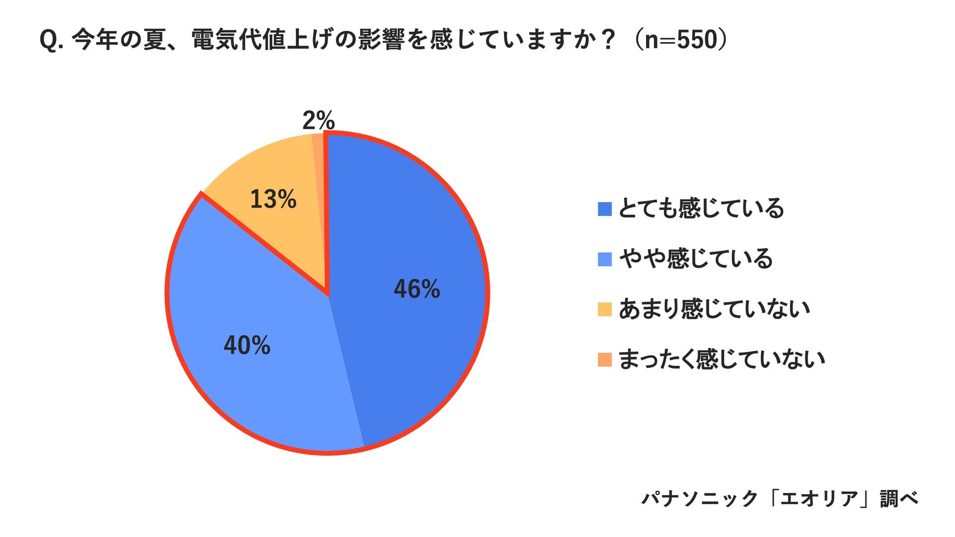 「今年の夏、電気代値上げの影響を感じていますか」という質問では、半数近くの46%が「とても感じている」、40%が「やや感じている」と、合計で86%が「感じている」と回答しました。