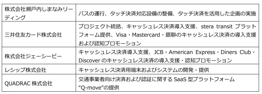 株式会社瀬戸内しまなみリーディング(本社:愛媛県今治市、代表取締役社長:宮本 敬治)、三井住友カード株式会社(本社:東京都江東区、代表取締役 社長執行役員 CEO:大西 幸彦、以下 三井住友カード)、株式会社ジェーシービー(本社:東京都港区、代表取締役会長兼執行役員社長:二重 孝好)、レシップ株式会社(本社:岐阜県本巣市、代表取締役社長:北野 元昭)、QUADRAC株式会社(本社:東京都中央区、代表取締役社長:高田 昌幸)は、2026年2月5日(木)に、しまなみバス3路線で三井住友カードの公共交通機関向けソリューション「stera transit」を活用したクレジットカード等(※)のタッチ決済サービスを開始します。