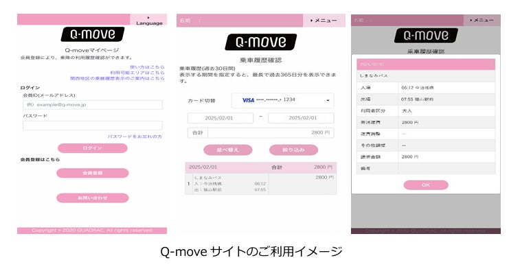 QUADRACのQ-moveサイト(https://q-move.info/)にアクセスし、マイページの会員登録手続きが完了しますと確認可能です。