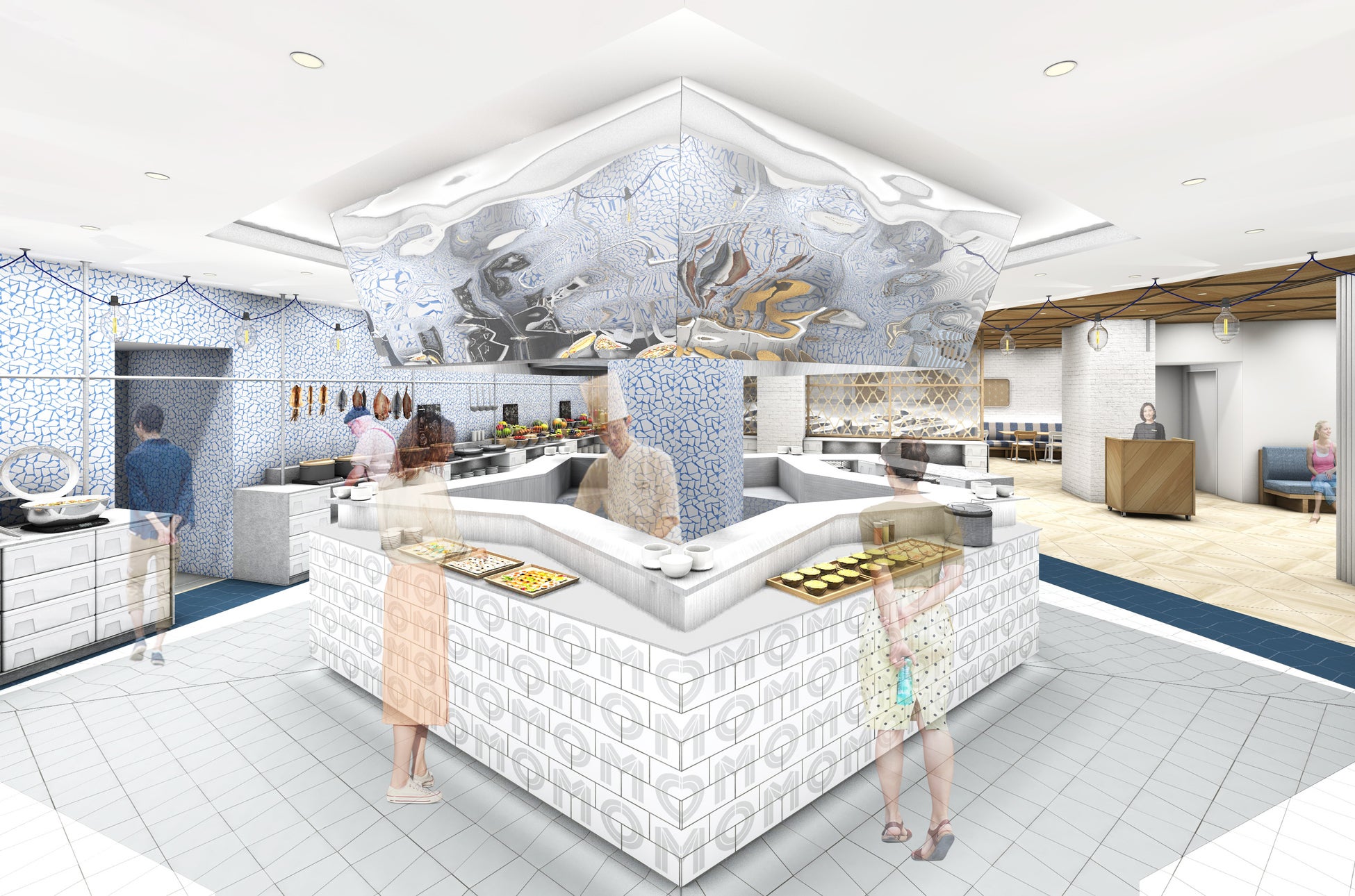 朝食を提供するOMOダイニング中央には、五稜郭をイメージしたライブキッチンがあり、目の前で仕上げた料理を星形のカウンターで提供します。明るく開放的な空間には、烏賊墨染のアートボードや漁網の照明など、豊富な漁場に恵まれた函館の海をイメージしデザインされた装飾が施されています。遊び心を感じるダイニングです。