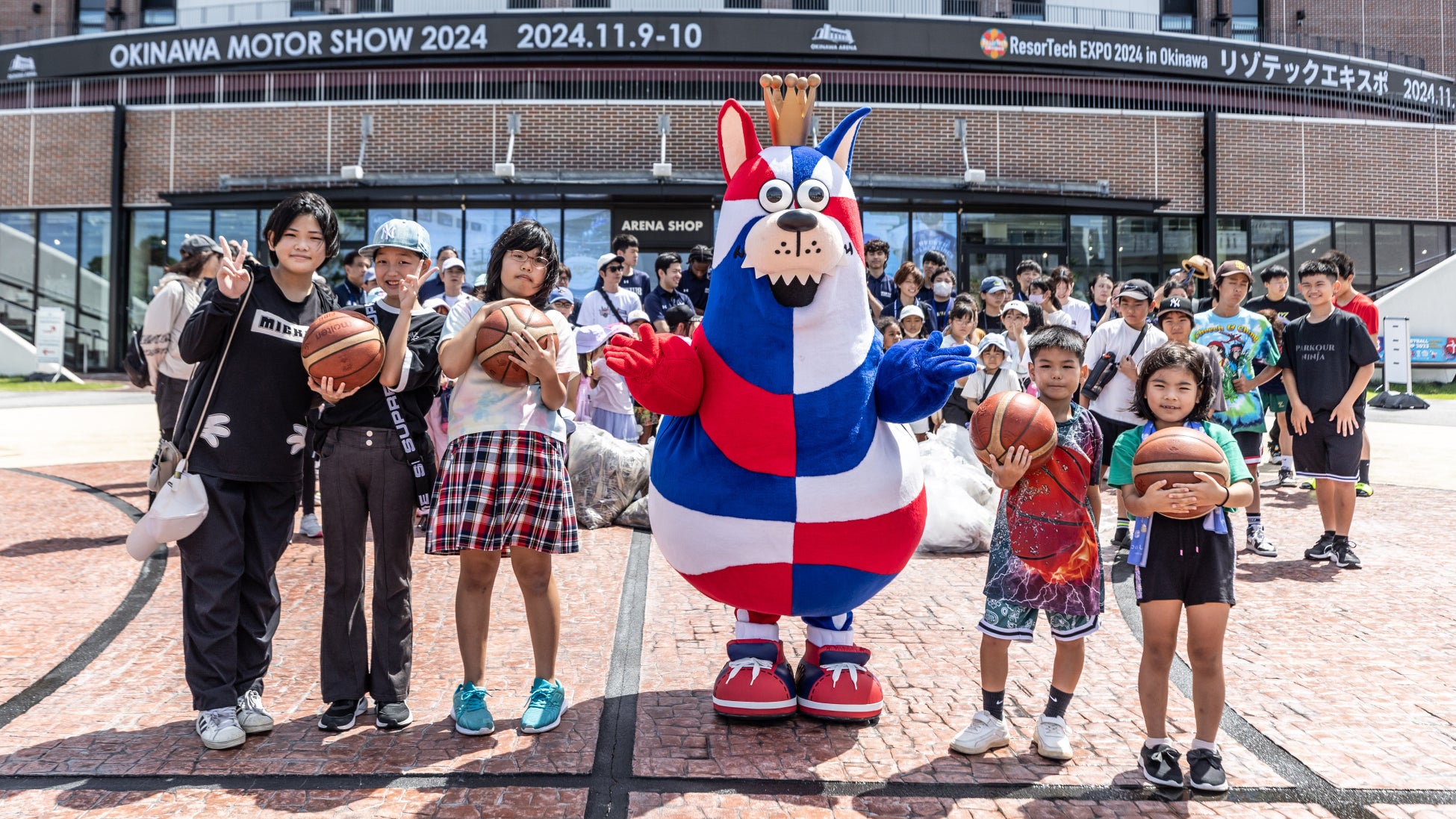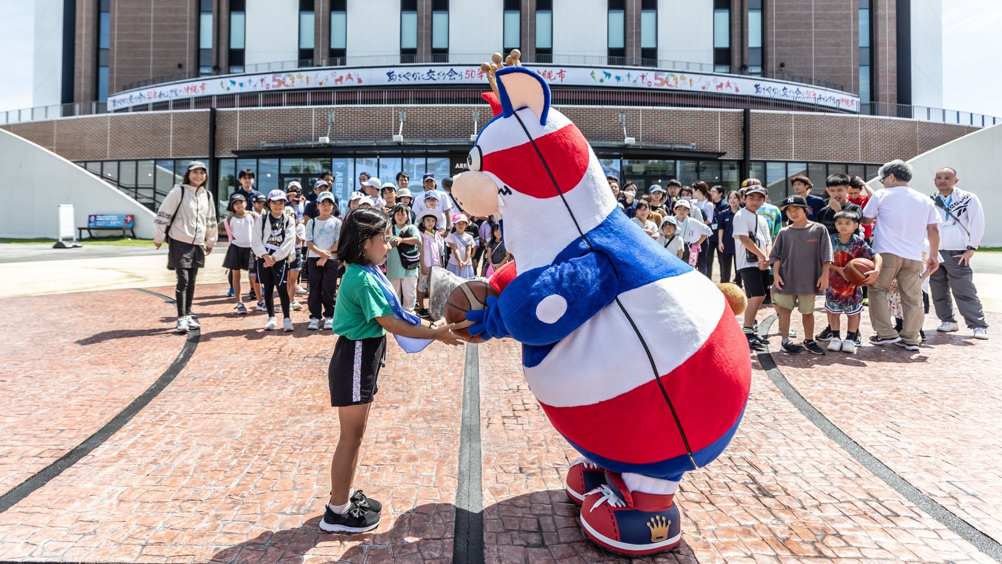また、美化活動後にはサプライズゲストとしてゴーディーが登場し、児童館4館へバスケットボールを寄贈しました。