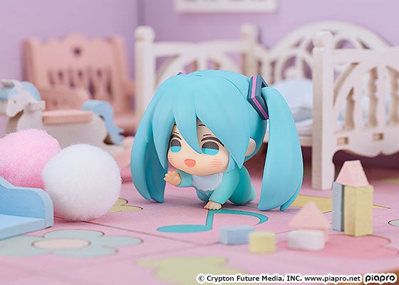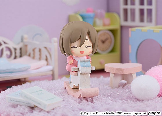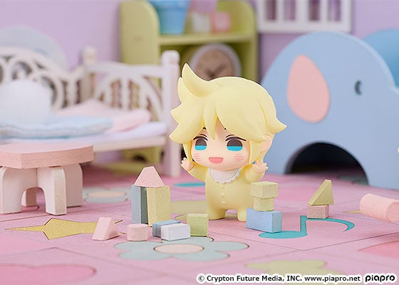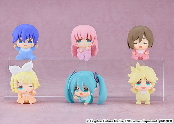 『ピアプロキャラクターズ』より、「初音ミク」「鏡音リン」「鏡音レン」「巡音ルカ」「MEIKO」「KAITO」の6人が“あかちゃん姿”のデフォルメフィギュアになって登場♪ボディパーツと頭部パーツは差し替え可能です。ぜひお手元でお楽しみください。