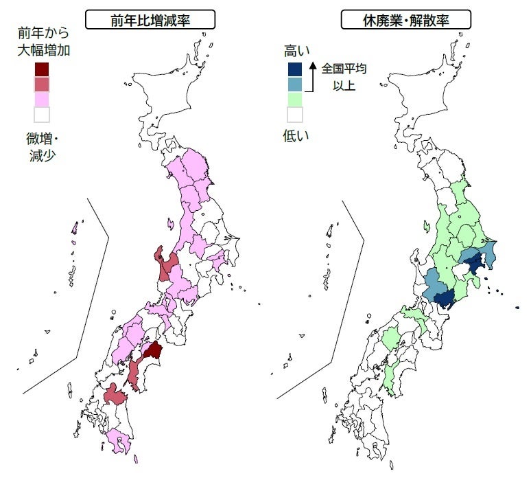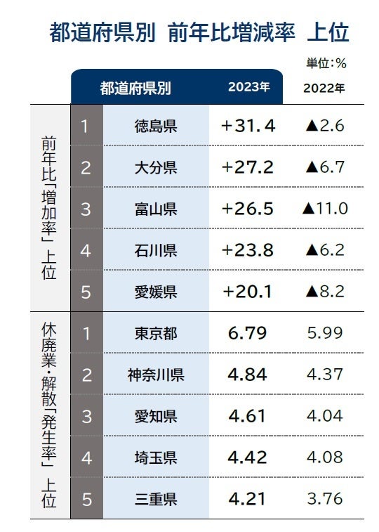前年と比較して、休廃業・解散の発生件数が増加した都道府県は43となり、前年(14)から大幅に増加した。このうち、最も増加率が大きいのは「徳島県」(31.4%増)で、全都道府県で唯一3割を超えた。以下、「大分県」(27.2%増)、「富山県」(26.5%増)、「石川県」(23.8%増)と続いた。一方、前年件数を下回ったのは「佐賀県」や「島根県」など4県にとどまり、前年(32)から大きく減少した。