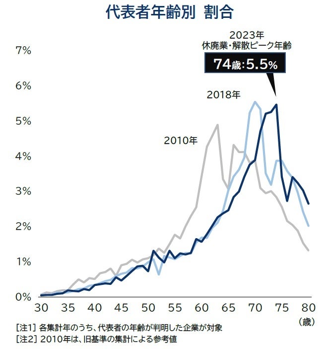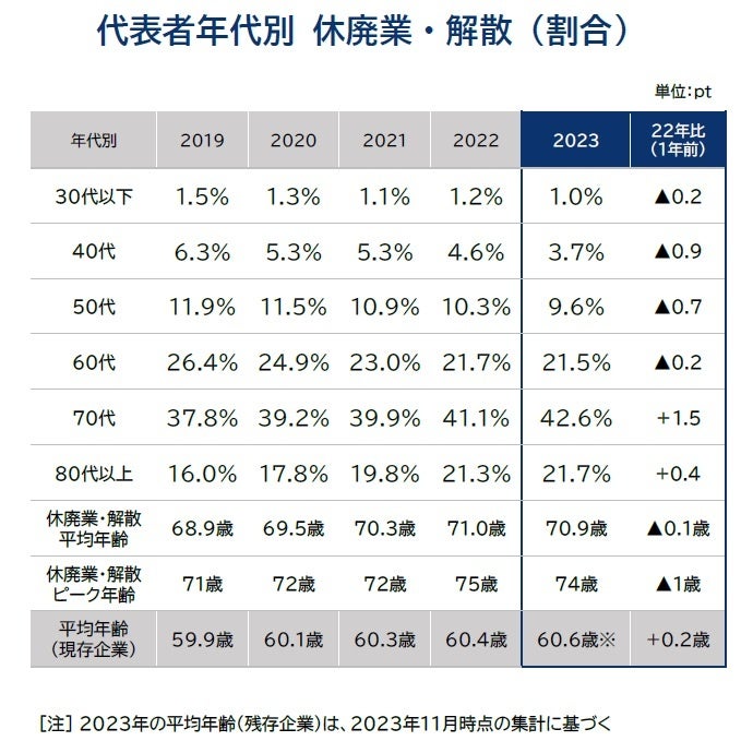代表者年代別:休廃業企業の経営者年齢、平均70.9歳 初めて前年から低下に転じる