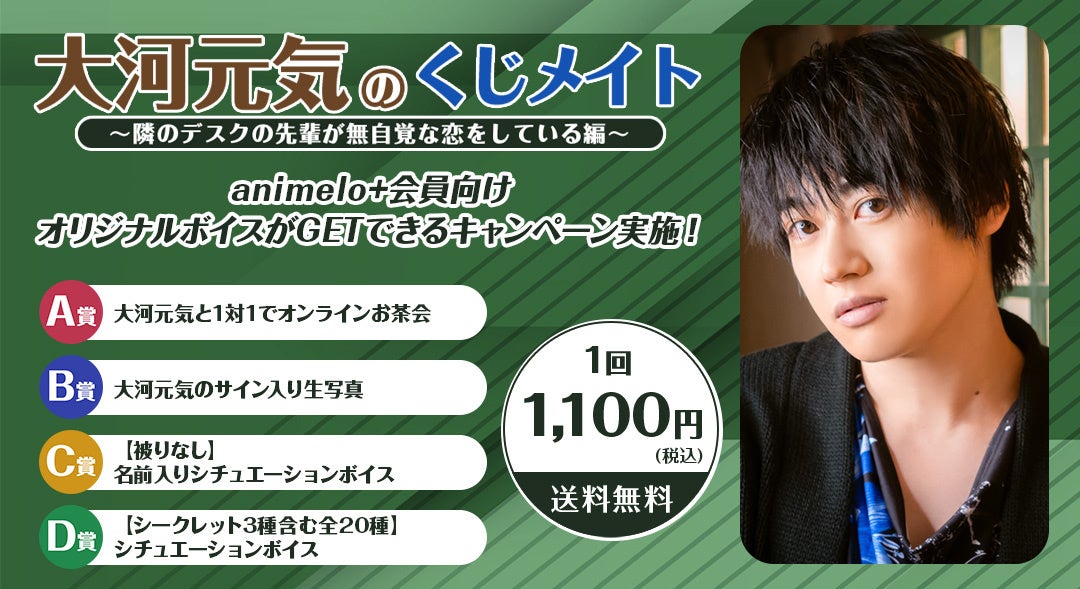本くじメイトにおける景品は、A賞が大河元気さんと1対1で直接お話ができるオンラインお茶会の参加権。B賞は大河元気さんのサイン入り生写真。C賞は "あなた" のお名前が入ったあなたに向けてのシチュエーションボイス。D賞は大河元気さん演じる会社の先輩とのシチュエーションボイス(全20種類。シークレットのボイス3種を含む)となります。