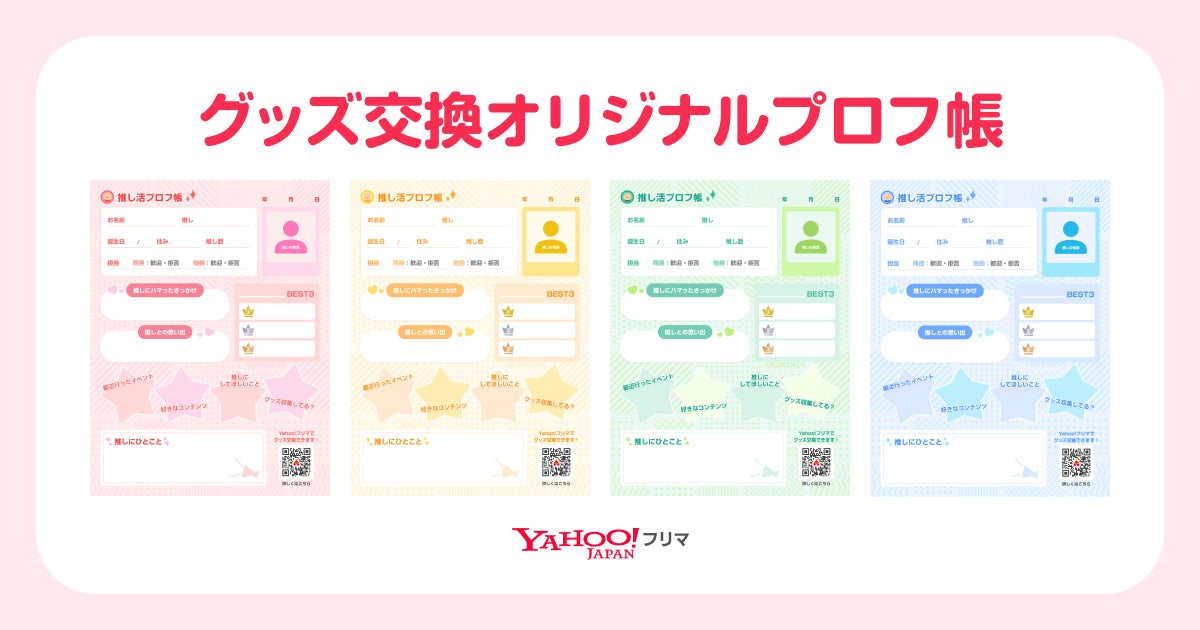 また、Yahoo!フリマグッズ交換公式X(@yahooflmgoodsjp)では、11月4日より「Yahoo!フリマ」オリジナルの「推し活プロフ帳」を配布します。プロフ帳は「推し活」ユーザーが、自己紹介や推しの好きなところをSNS上で共有するために利用されており、今回提供する「推し活プロフ帳」は4パターンのカラーがあり、11月4日からYahoo!フリマグッズ交換公式Xのポストからダウンロードできます。