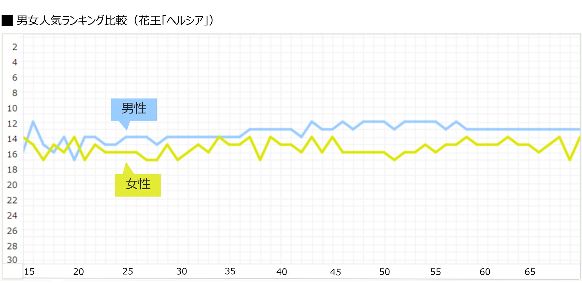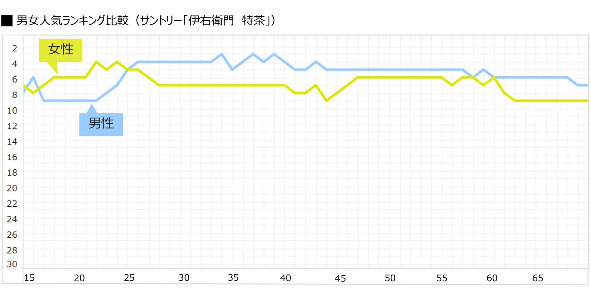 サントリー「伊右衛門 特茶」と、花王「ヘルシア」の性別による人気ランキング推移の差も見てみます。