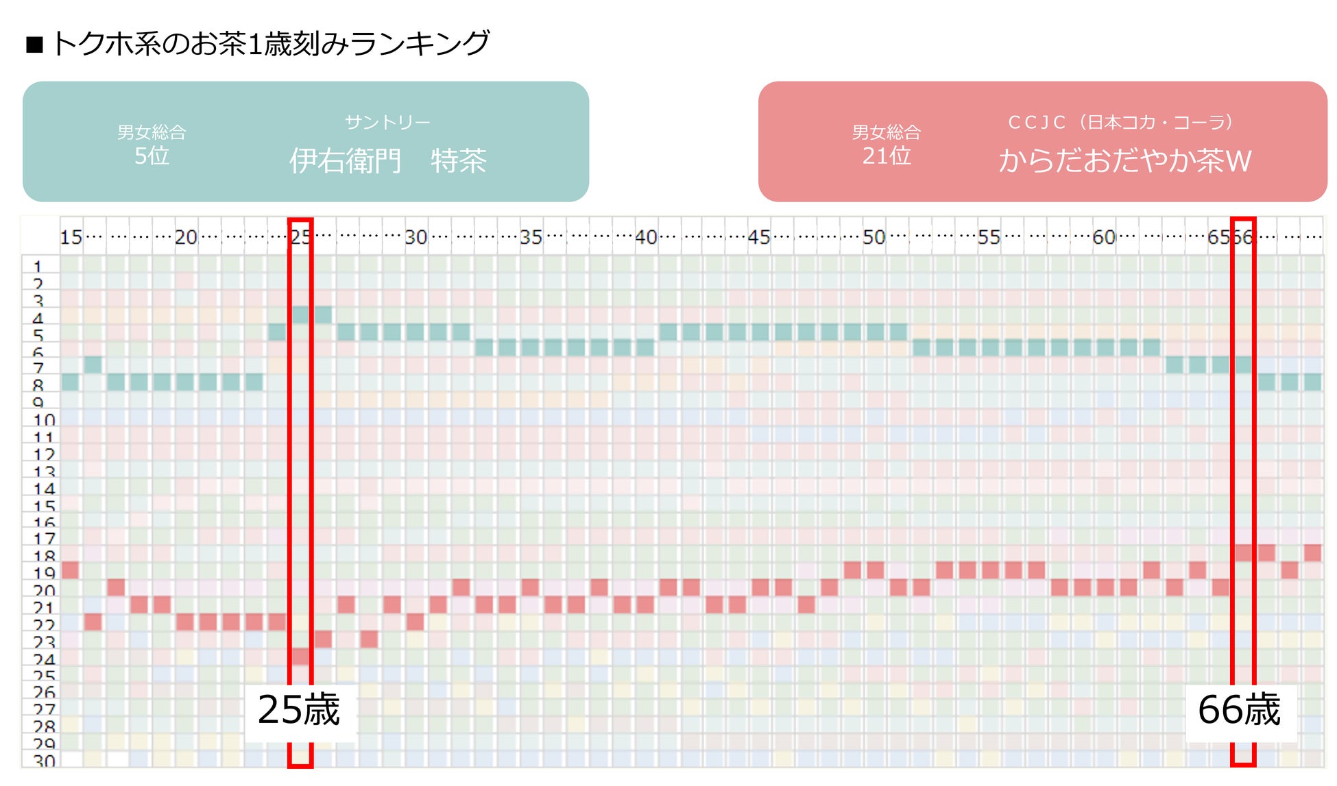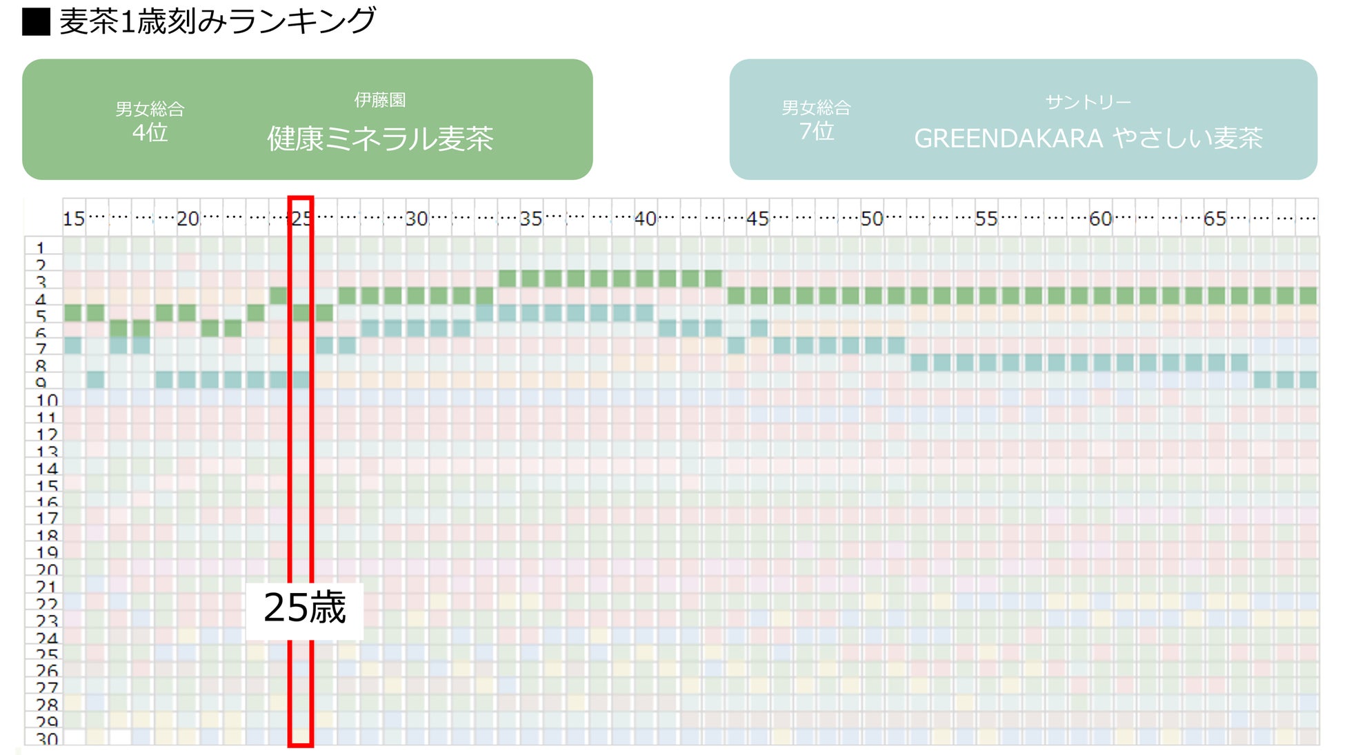 4位以降は麦茶や烏龍茶など、さまざまな種類のお茶はもちろん、機能性表示食品(機能性)や特定保健用食品(トクホ)の商品もランクインしています。好みや目的に応じて、購入する商品はどのように変化するのか、ブランドごとに1歳刻みのランキングを読み解きます。
