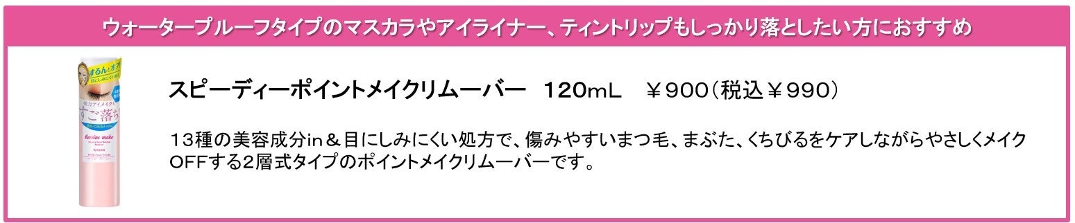 落ちにくいウォータープルーフマスカラも塗るだけですばやくなじみ、溶けるようにするんと落とします。