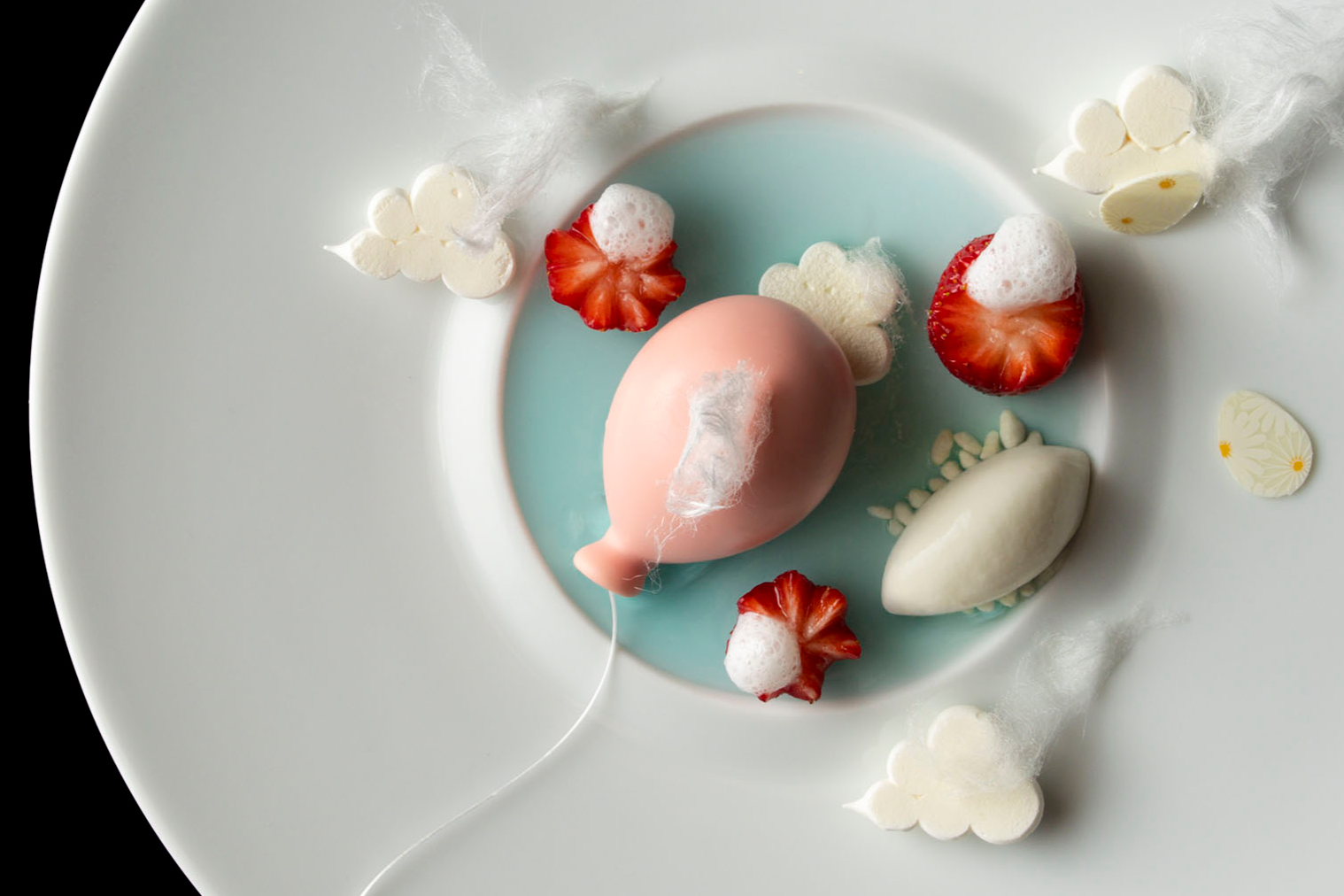 イースターをお祝いする、空に浮かぶ風船に見立てたデザートです。ホワイトチョコレートのムースでできた風船を割ると、ライムが爽やかに香る苺のコンポートが現れます。まろやかなフロマージュブランのソルベ、空を舞うカルピス味のコットンキャンディーと共にお楽しみください。この新作デザートは、ランチ・ディナーコースに加え、特別にティータイムでもご用意いたします。