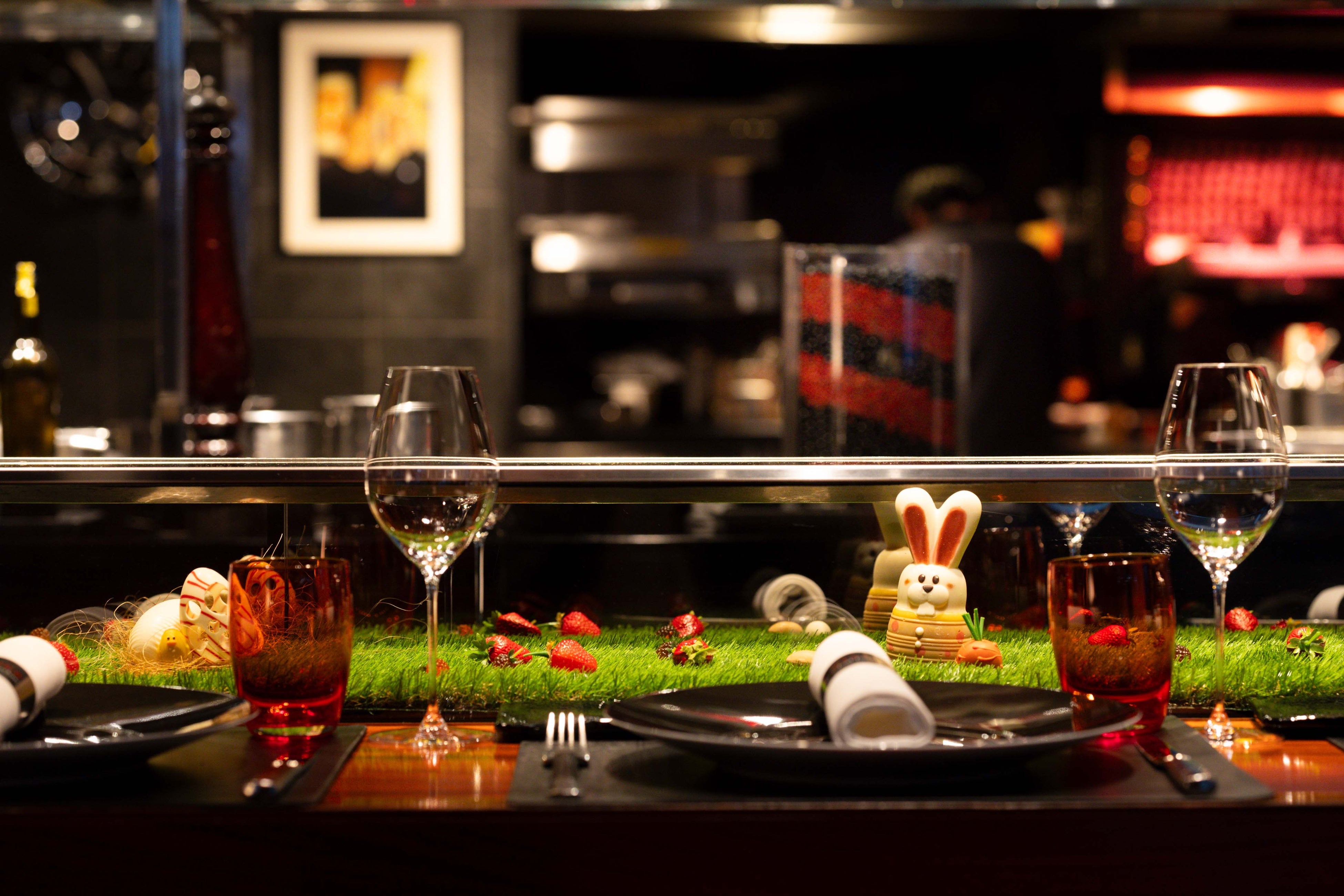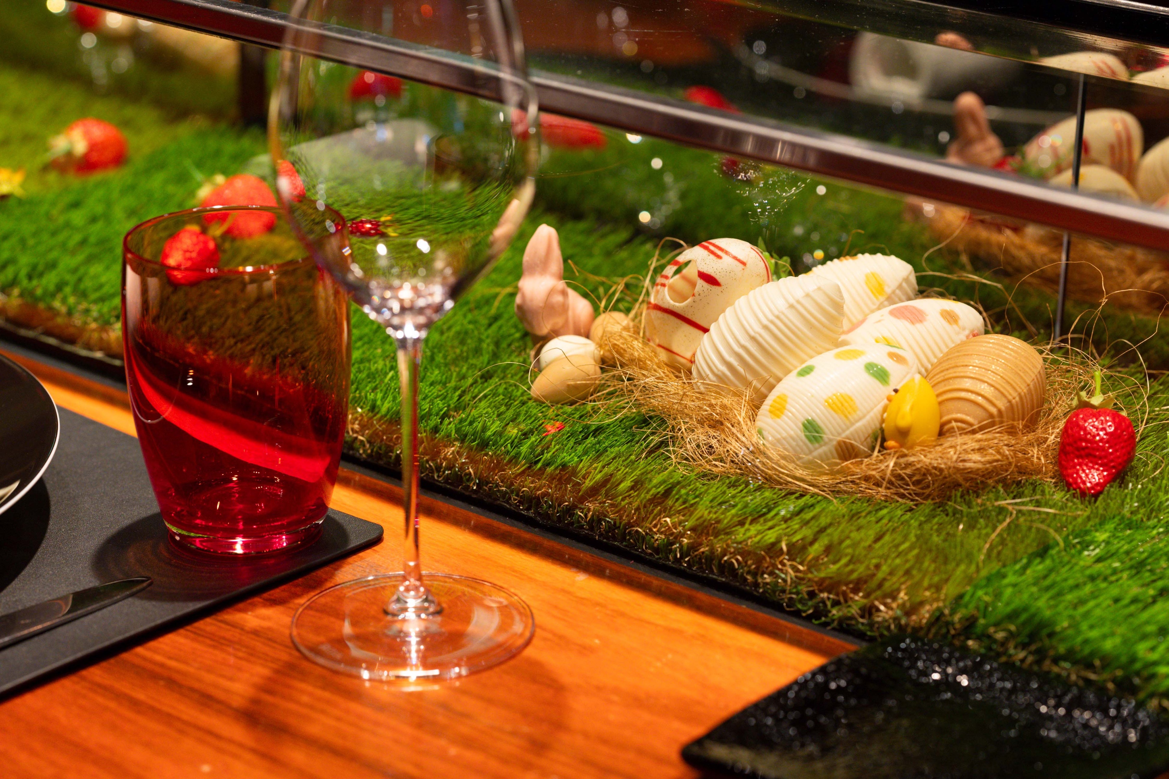 また同店の象徴的なロングカウンター前のショーケースは季節ごとに装いを変え、お客様をお出迎えしています。今春はイースターから着想を得たうさぎやヒヨコ、草原に潜む卵がショーケースを彩ります。