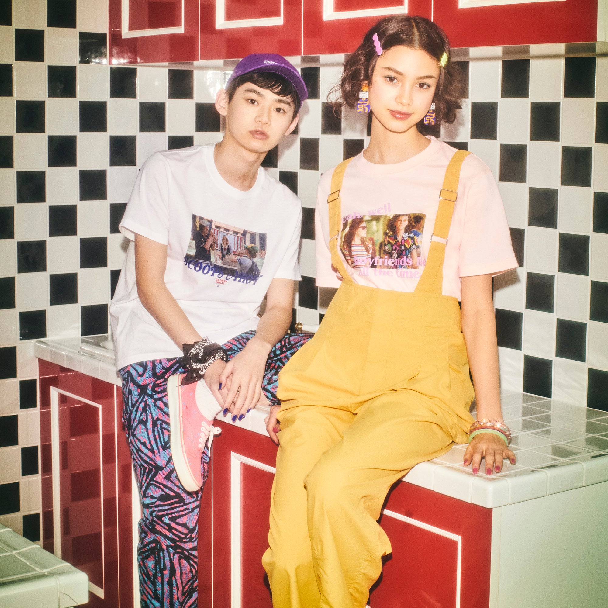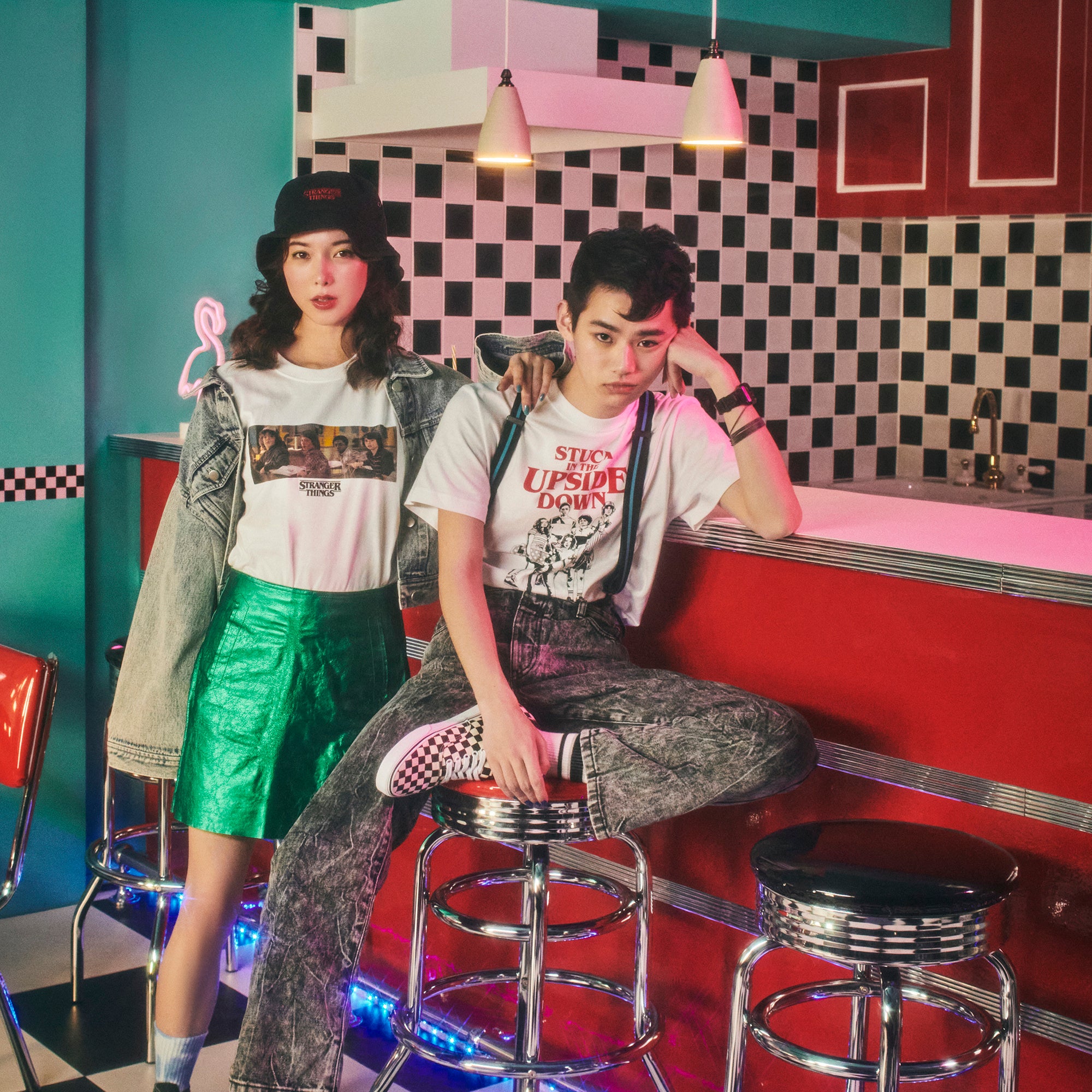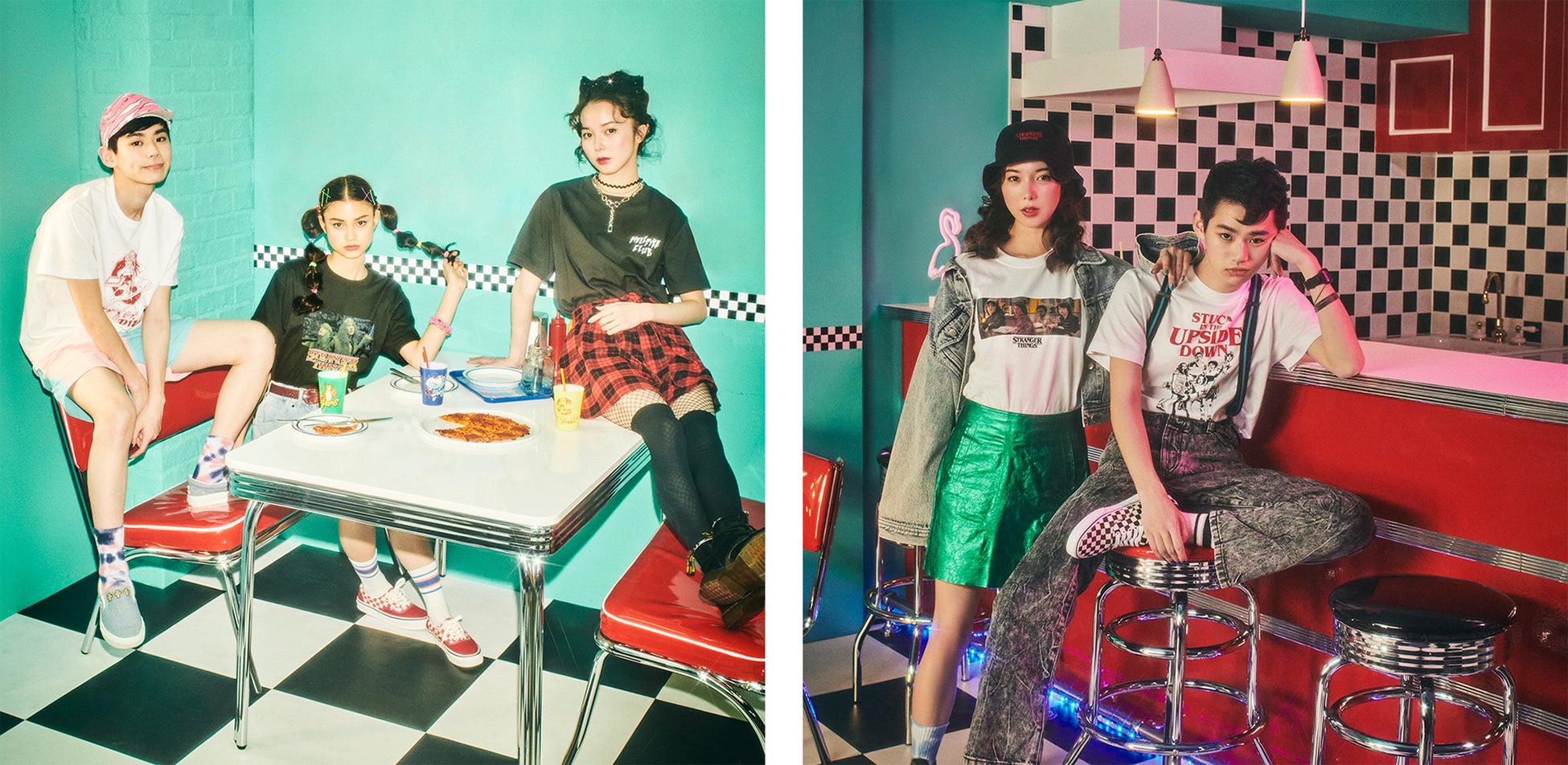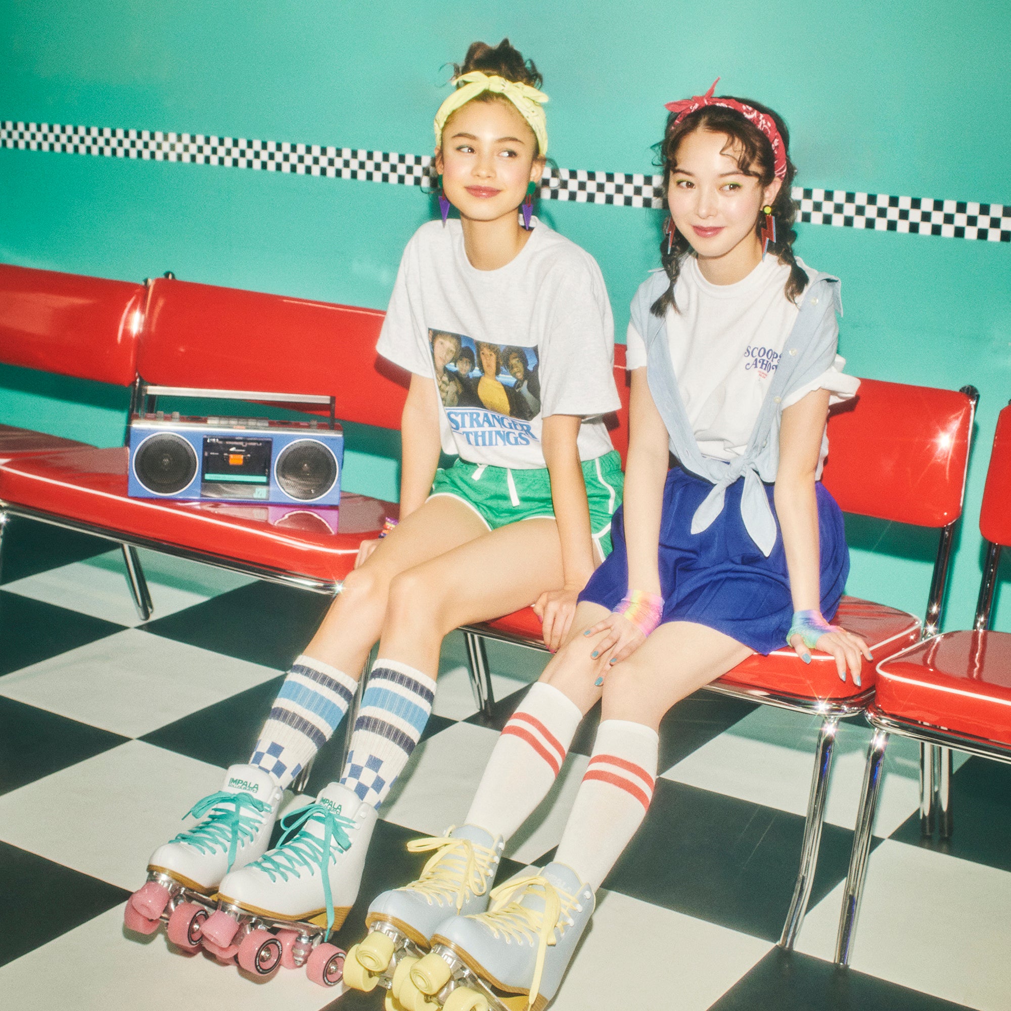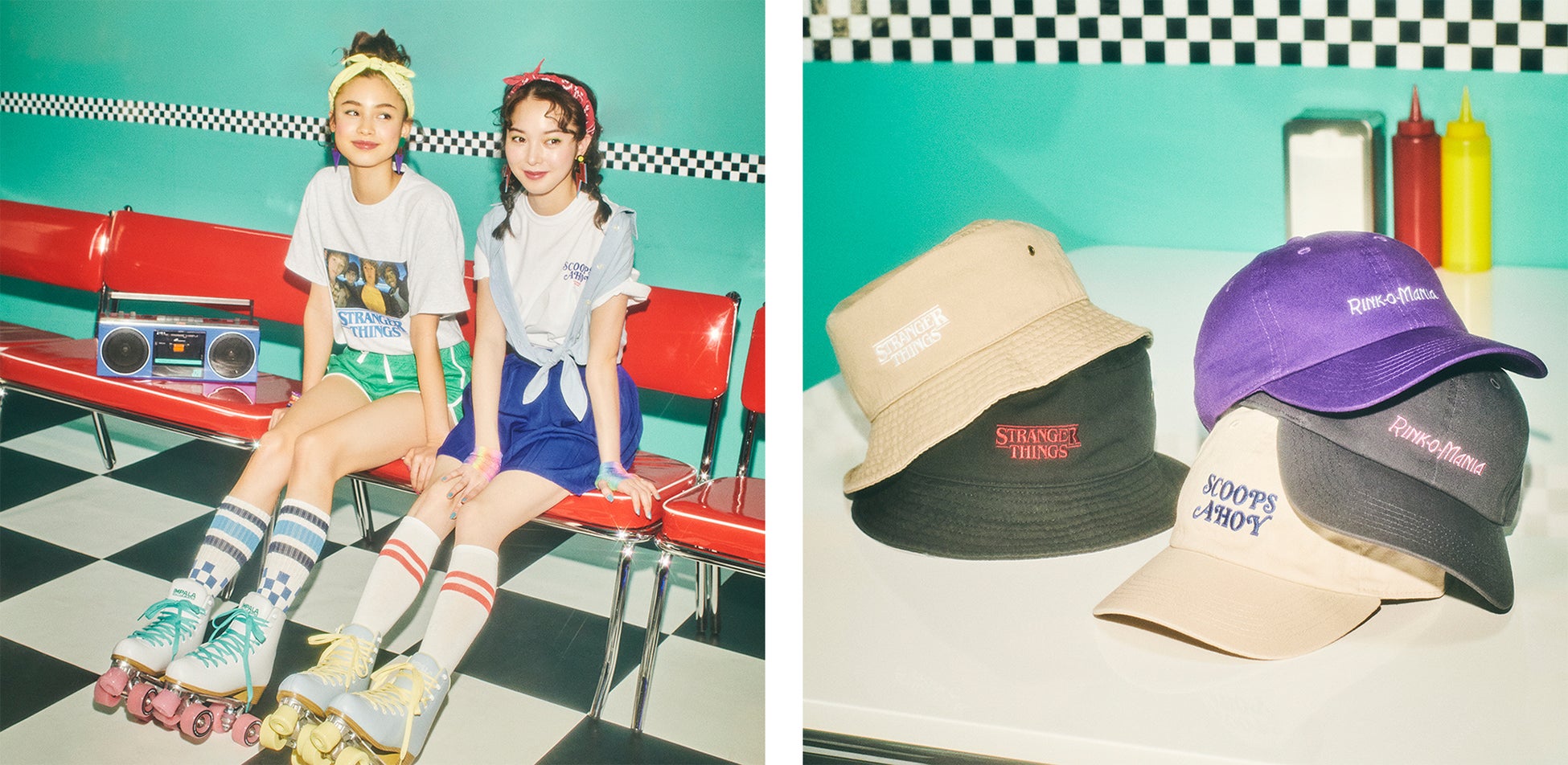 『ストレンジャー・シングス』の舞台、1980年代アメリカのポップカルチャーを感じさせるテイストで、作中で描かれる「友情」をデザインに落とし込んだ今回のコレクション。スケートリンク“RINK-O-MANIA”、アイスクリームショップ“SCOOPS AHOY”やピザショップ“Surfer Boy Pizza”、さらにはシーズン4で登場する「エディ」が率いるクラブ“HELLFIRE CLUB”など、作品内で印象的な数々のロゴを採用したアイテムもそろいます。