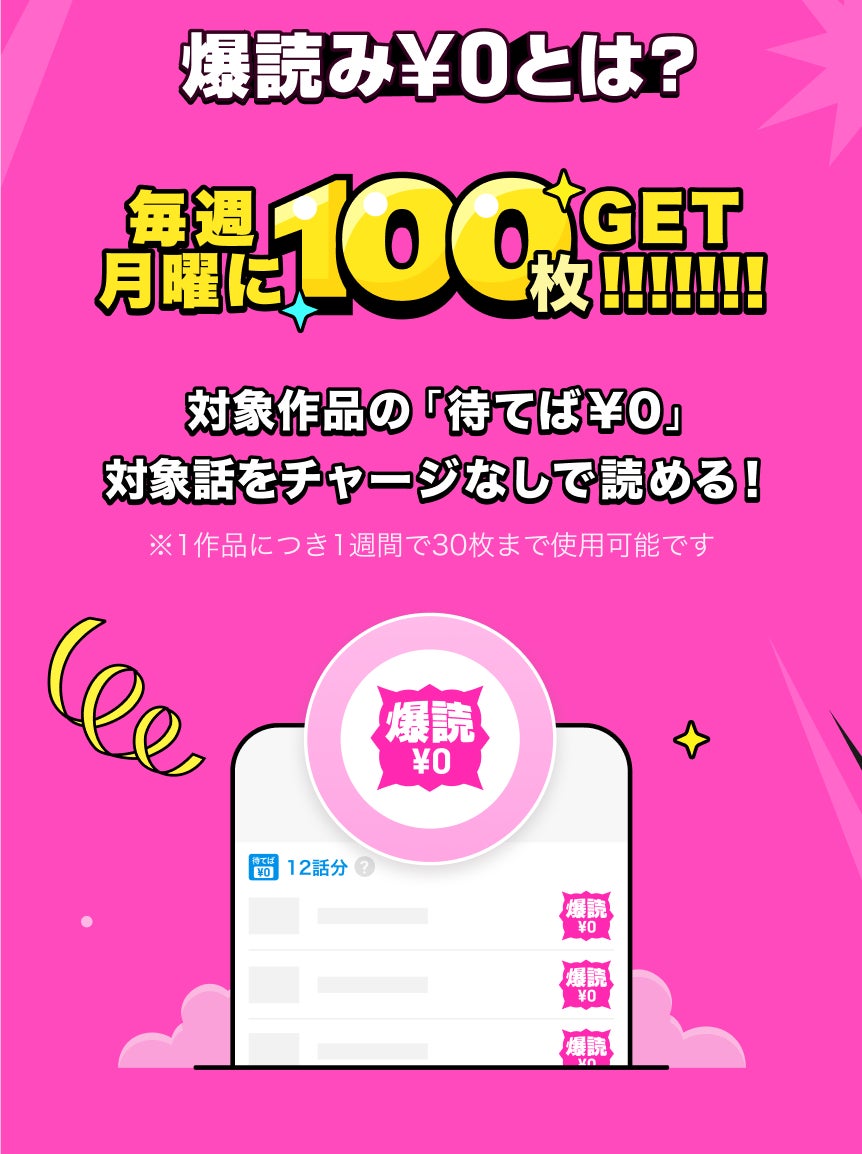 サービス概要: 毎週月曜日に「爆読み¥0券」を100枚GET。