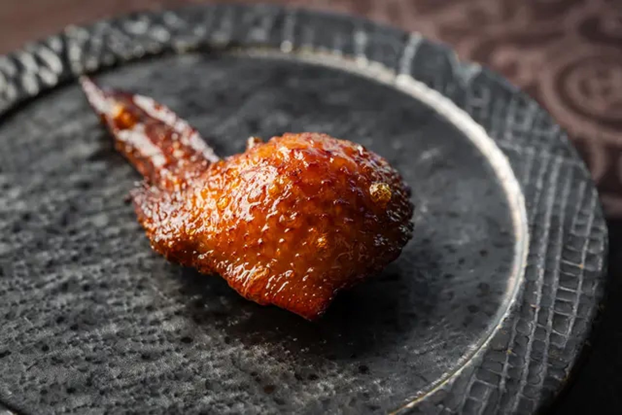 山梨県産の信玄鷄手羽先の中に、カシューナッツと麹を使ったフォアグラの代替食材「ヴィーガンフォアグラ」を詰めた一品。
